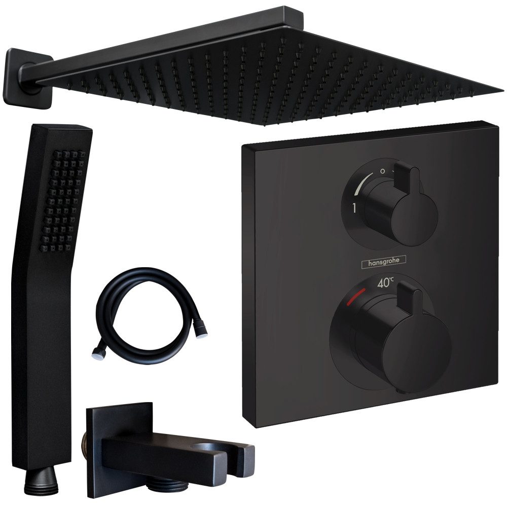 Lieferumfang | [OPTIONAL] Hansgrohe iBox 1 Grundkörper universal, 01800180 Hansgrohe Ecostat Square Thermostat Unterputz für 2 Verbraucher, 15714670 Jowi Handbrause, Mattschwarz Jowi Wandanschlussbogen mit Wandbrausehalter, Mattschwarz Jowi Brauseschlauch 1500mm, Mattschwarz Jowi Kopfbrause, 300x300mm oder 360x360mm Jowi Brausearm, Gesamtlänge: 400mm |