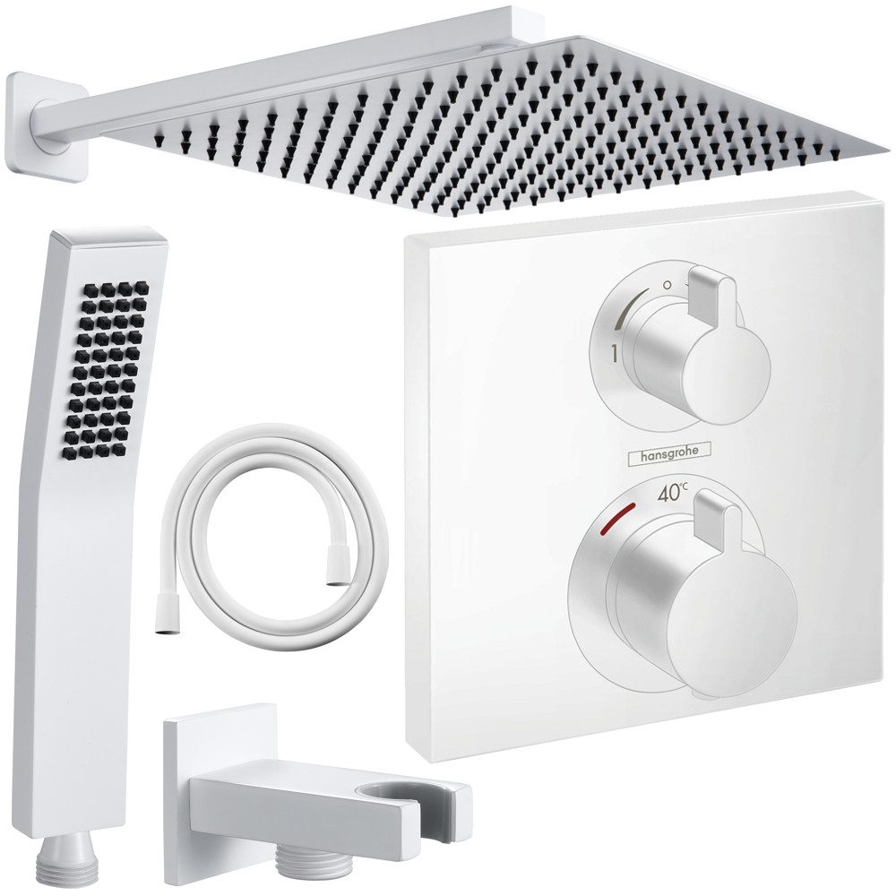Lieferumfang | [OPTIONAL] Hansgrohe iBox 1 Grundkörper universal, 01800180 Hansgrohe Ecostat Square Thermostat Unterputz für 2 Verbraucher, 15714700 Jowi Handbrause, Messing Mattweiß, Farbe der Düsen: Schwarz Jowi Wandanschlussbogen mit Wandbrausehalter, Messing Mattweiß Jowi Brauseschlauch 1500mm, Mattweiß Jowi Kopfbrause, 300x300mm oder 360x360mm, Farbe der Düsen: Schwarz Jowi Brausearm, Gesamtlänge: 400mm |