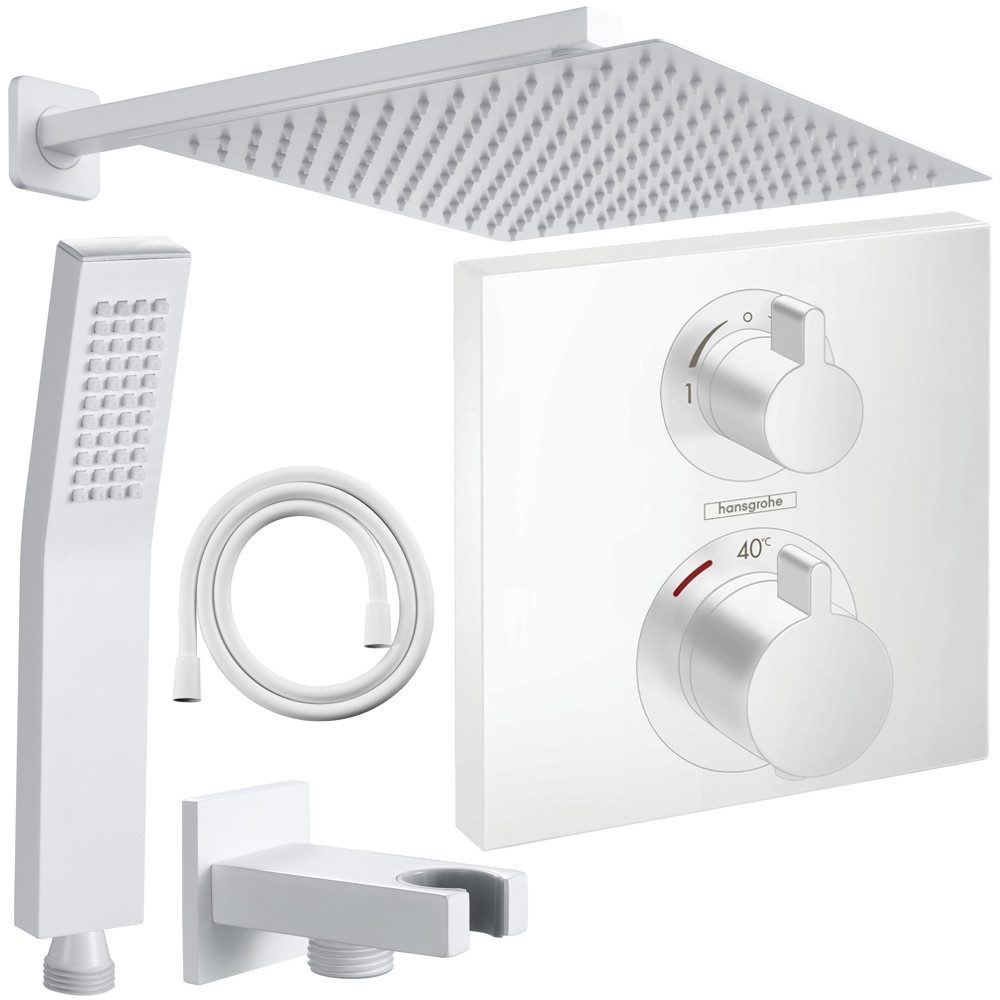 Lieferumfang | [OPTIONAL] Hansgrohe iBox 1 Grundkörper universal, 01800180 Hansgrohe Ecostat Square Thermostat Unterputz für 2 Verbraucher, 15714700 Jowi Handbrause, Messing Mattweiß, Farbe der Düsen: Weiß Jowi Wandanschlussbogen mit Wandbrausehalter, Messing Mattweiß Jowi Brauseschlauch 1500mm, Mattweiß Jowi Kopfbrause, 300x300mm oder 360x360mm, Farbe der Düsen: Weiß Jowi Brausearm, Gesamtlänge: 400mm |