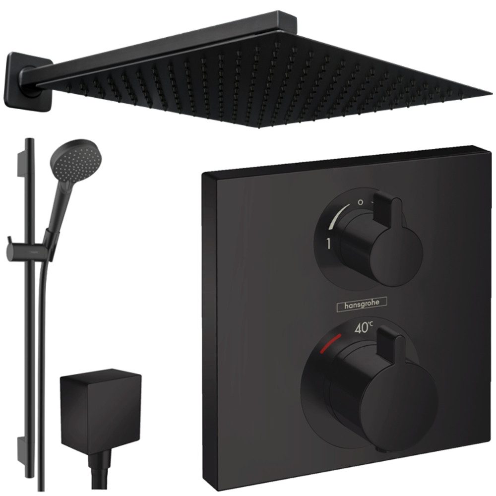 Lieferumfang | [OPTIONAL] Hansgrohe iBox 1 Grundkörper universal, 01800180 Hansgrohe Ecostat Square Thermostat Unterputz für 2 Verbraucher, 15714670 Hansgrohe Vernis Blend Brauseset 100 Vario mit Brausestange S Puro 65 cm, 26422670 Hansgrohe FixFit Wandanschluss Square mit Rückflussverhinderer, 26455670 Jowi Kopfbrause, 300x300mm oder 360x360mm Jowi Brausearm, Gesamtlänge: 400mm |