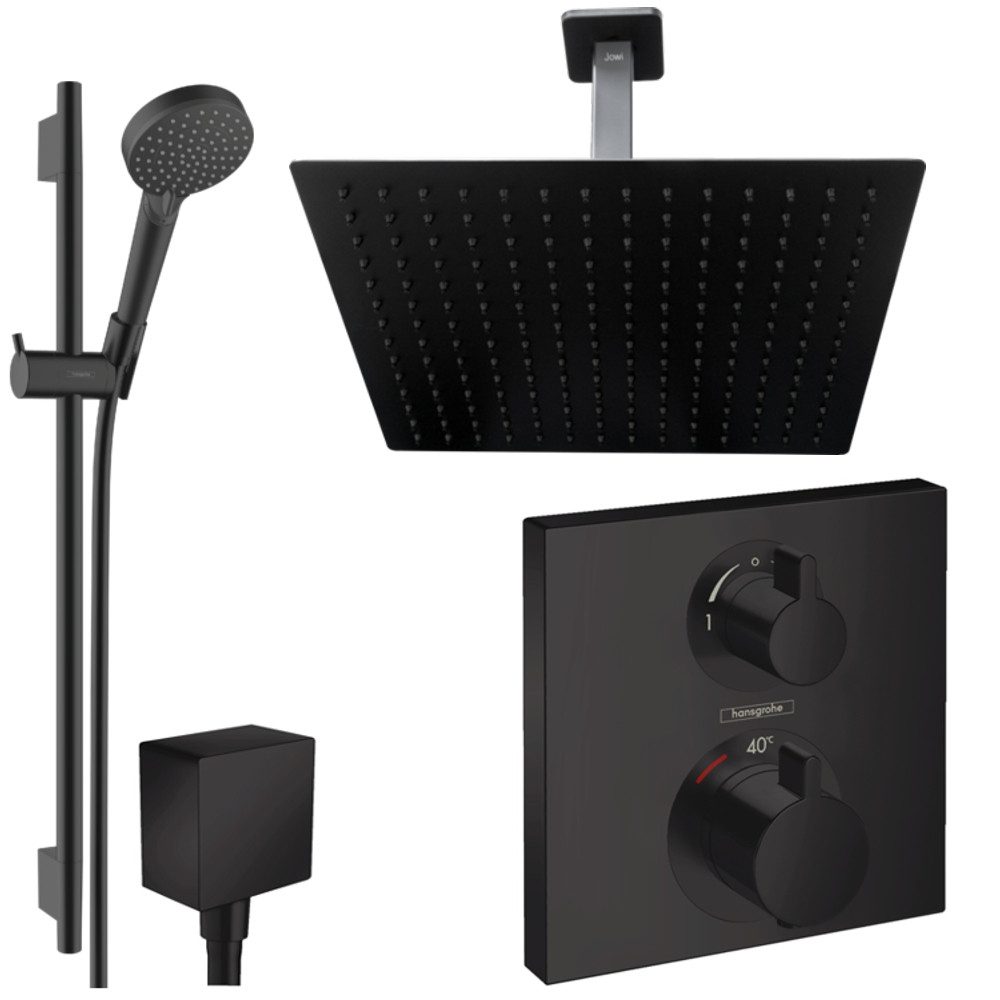 Lieferumfang | [OPTIONAL] Hansgrohe iBox 1 Grundkörper universal, 01800180 Hansgrohe Ecostat Square Thermostat Unterputz für 2 Verbraucher, 15714670 Hansgrohe Vernis Blend Brauseset 100 Vario mit Brausestange S Puro 65 cm, 26422670 Hansgrohe FixFit Wandanschluss Square mit Rückflussverhinderer, 26455670 Jowi Kopfbrause, 300x300mm oder 360x360mm Jowi Deckenanschluss, Gesamtlänge: 155mm |