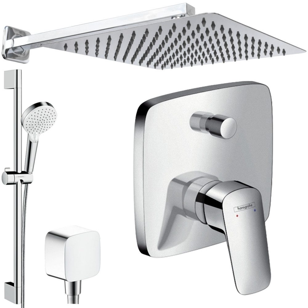 Lieferumfang | [OPTIONAL] Hansgrohe iBox 1 Grundkörper universal, 01800180 Hansgrohe Logis Einhebel-Wannenmischer Unterputz, 71405000 Hansgrohe Crometta Brauseset Vario mit Brausestange 65 cm, 26532400 Hansgrohe Fixfit Schlauchanschluss, 26457000 Jowi Kopfbrause, 250x250 oder 300x300mm oder 360x360mm Jowi Brausearm, Gesamtlänge: 400mm |