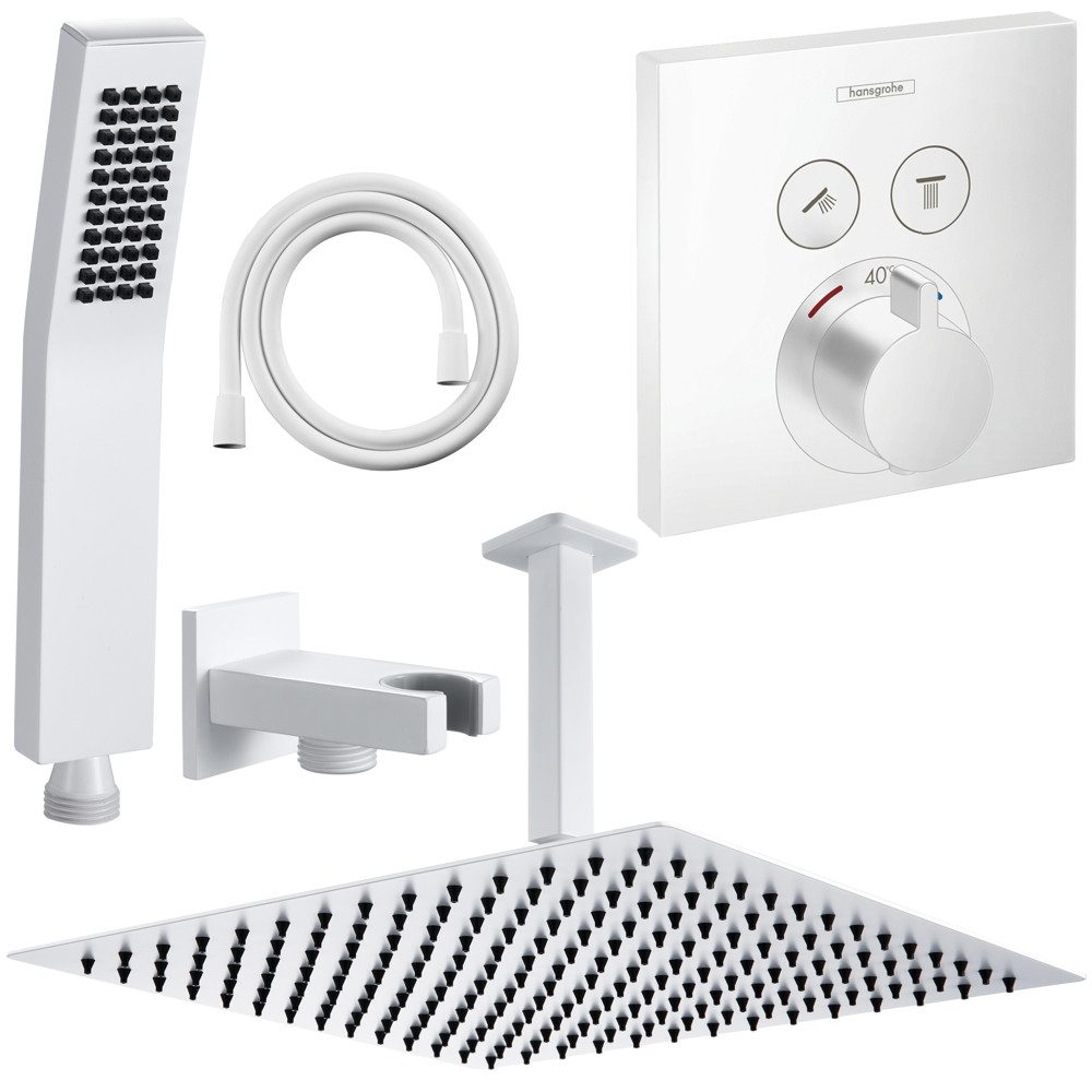 Lieferumfang | [OPTIONAL] Hansgrohe iBox 1 Grundkörper universal, 01800180 Hansgrohe ShowerSelect Thermostat Unterputz für 2 Verbraucher, 15763700 Jowi Handbrause, Messing Mattweiß, Farbe der Düsen: Schwarz Jowi Wandanschlussbogen mit Wandbrausehalter, Messing Mattweiß Jowi Brauseschlauch 1500mm, Mattweiß Jowi Kopfbrause, 300x300mm oder 360x360mm, Farbe der Düsen: Schwarz Jowi Deckenanschluss, Gesamtlänge: 155mm |