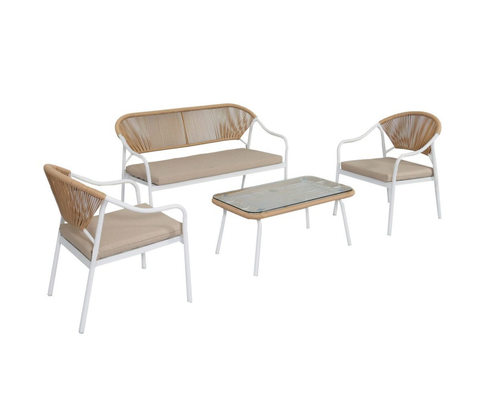 Tauchen Sie ein in die einzigartige Eleganz unseres vierteiligen Sets, das durch seine besondere Webart und natürlichen Akzente Ihren Außenbereich bereichert. Egal, ob Sie alleine im Garten entspannen oder mit Familie und Freunden auf der Terrasse einen Drink genießen - dieses Set vereint bequemen Sitzkomfort mit zeitloser Stil-Eleganz.