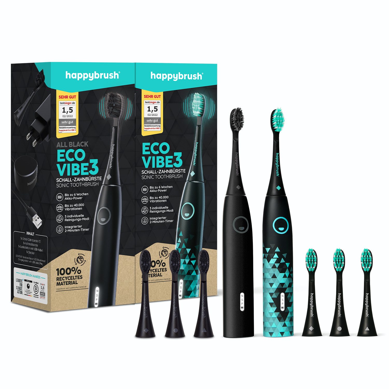 Lieferumfang | Das Set enthält: 2x Schall-Zahnbürste Eco VIBE 3 und 9x Aufsteckbürsten. |