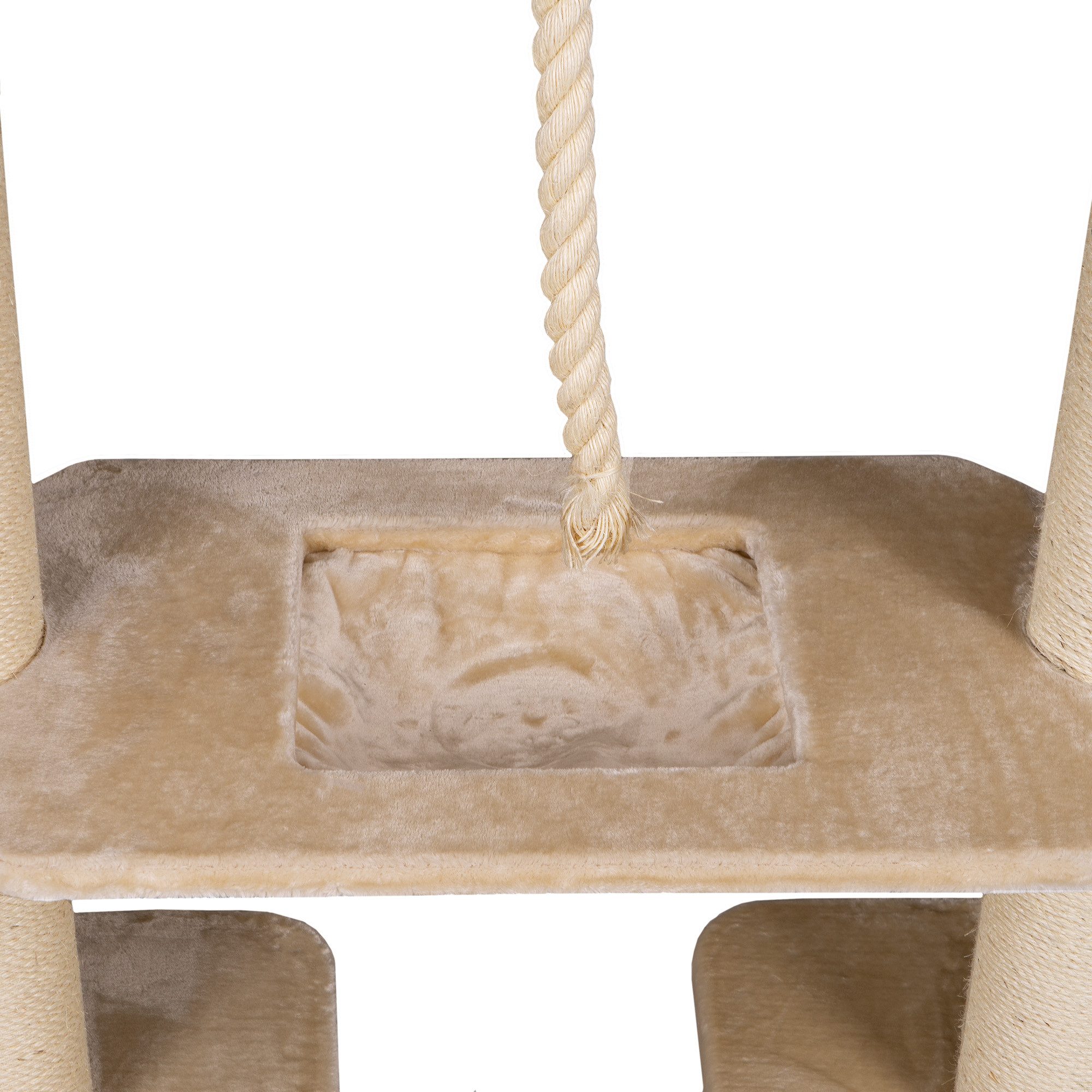Eine der Verbindungsplatten verfügt über eine integrierte große Liegemulde, in der Ihre Katze entspannt dösen oder sich zurückziehen kann. Die zweite Platte ist mit einem großzügigen Durchgangsloch von Ø 24 cm in der Mitte versehen, das Ihrer Katze den Durchstieg zwischen den Ebenen ermöglicht. Für zusätzlichen Spielspaß sorgt das dicke Spielseil, das zum Klettern und Toben einlädt – perfekte Ergänzung für aktive Katzen.
