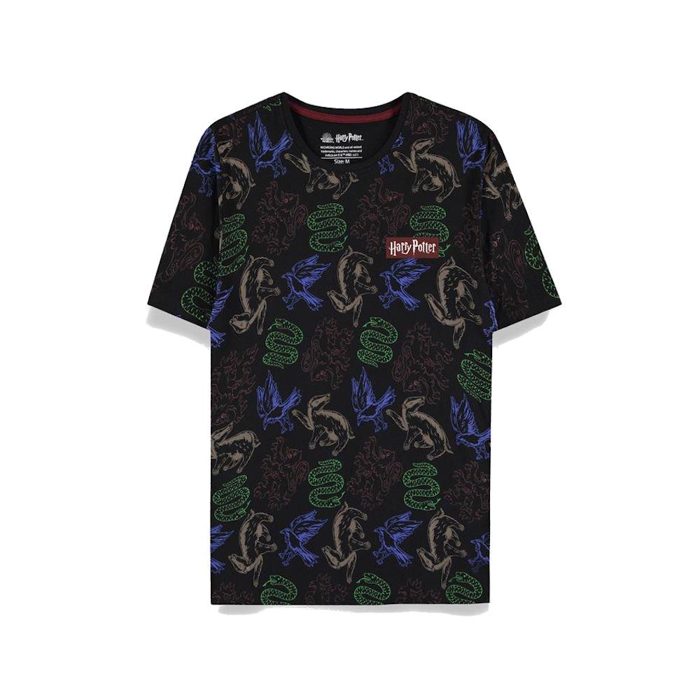 Das T-Shirt zeigt die Tiere der Hogwarts-Häuser Gryffindor, Slytherin, Hufflepuff und Ravenclaw.