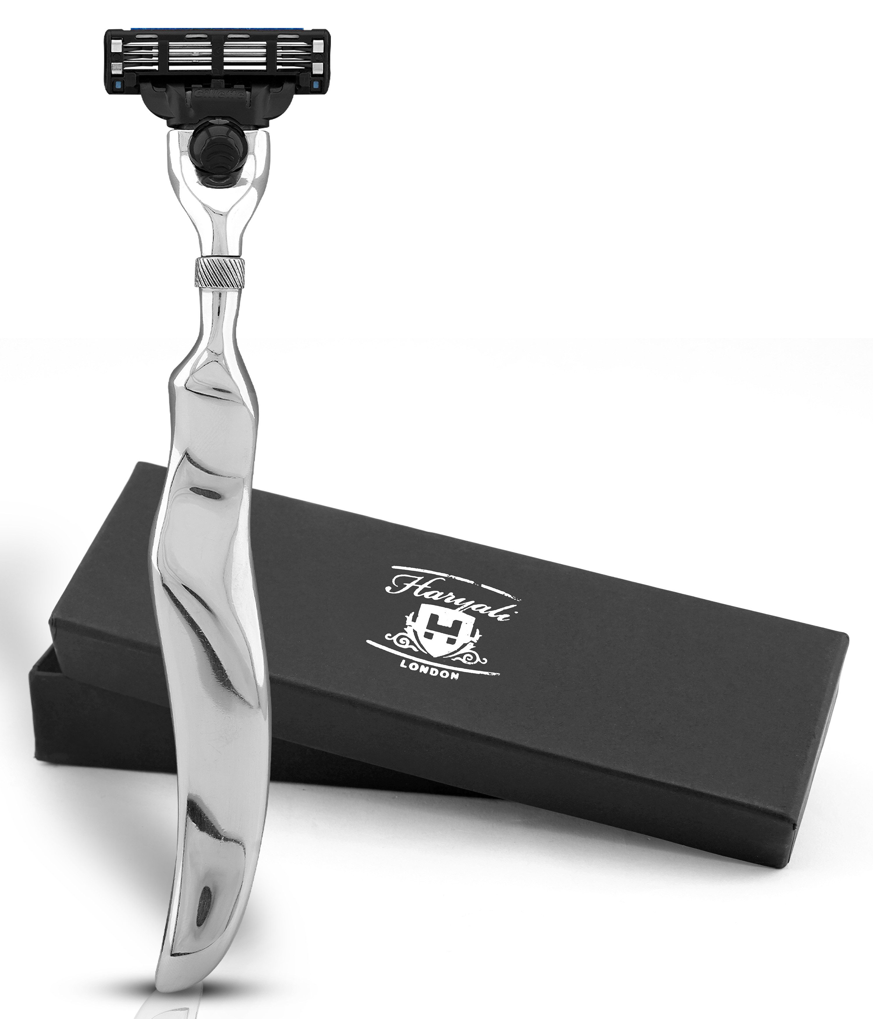 Haryali London Nassrasierer 3-Klingen-Rasierer für Herren, Edelstahl, langer Griff, Damenrasierer, Pack, Abnehmbarer Systemrasierer mit Edelstahlgriff, Abwaschbarer, rutschfester Griff. Passt auf alle Mach 3-Rasierer.