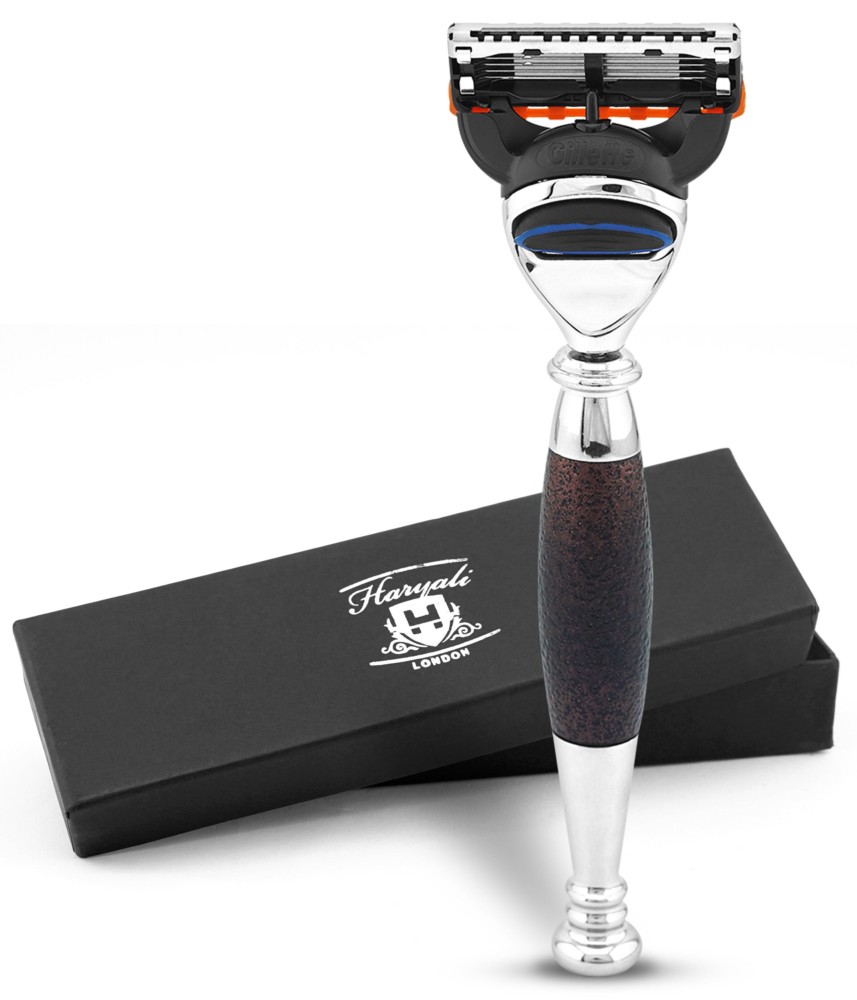 Haryali London Nassrasierer 5-Klingen-Unisex-Rasierer für Körper und Gesicht, Kastanienbraun, Pack, Rasierer mit Klinge und Messing-Silber-Finish, Abwaschbarer, rutschfester Griff. Passend für alle Fusion5 Rasier.