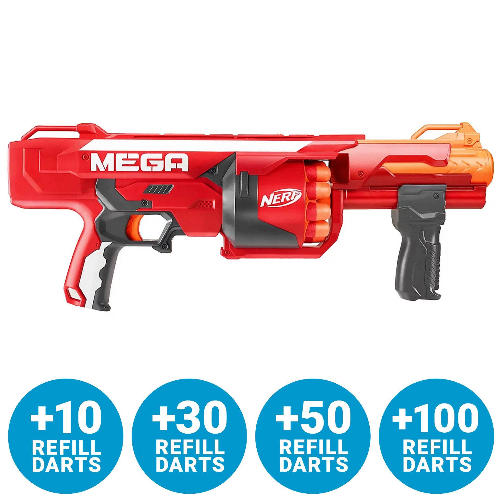 Ausstattung | - 1x NERF Mega RotoFury Blaster- 10x NERF Mega Darts- Optional: 1x, 3x, 5x oder 10x Nachfüllpackungen mit je 10 Darts |