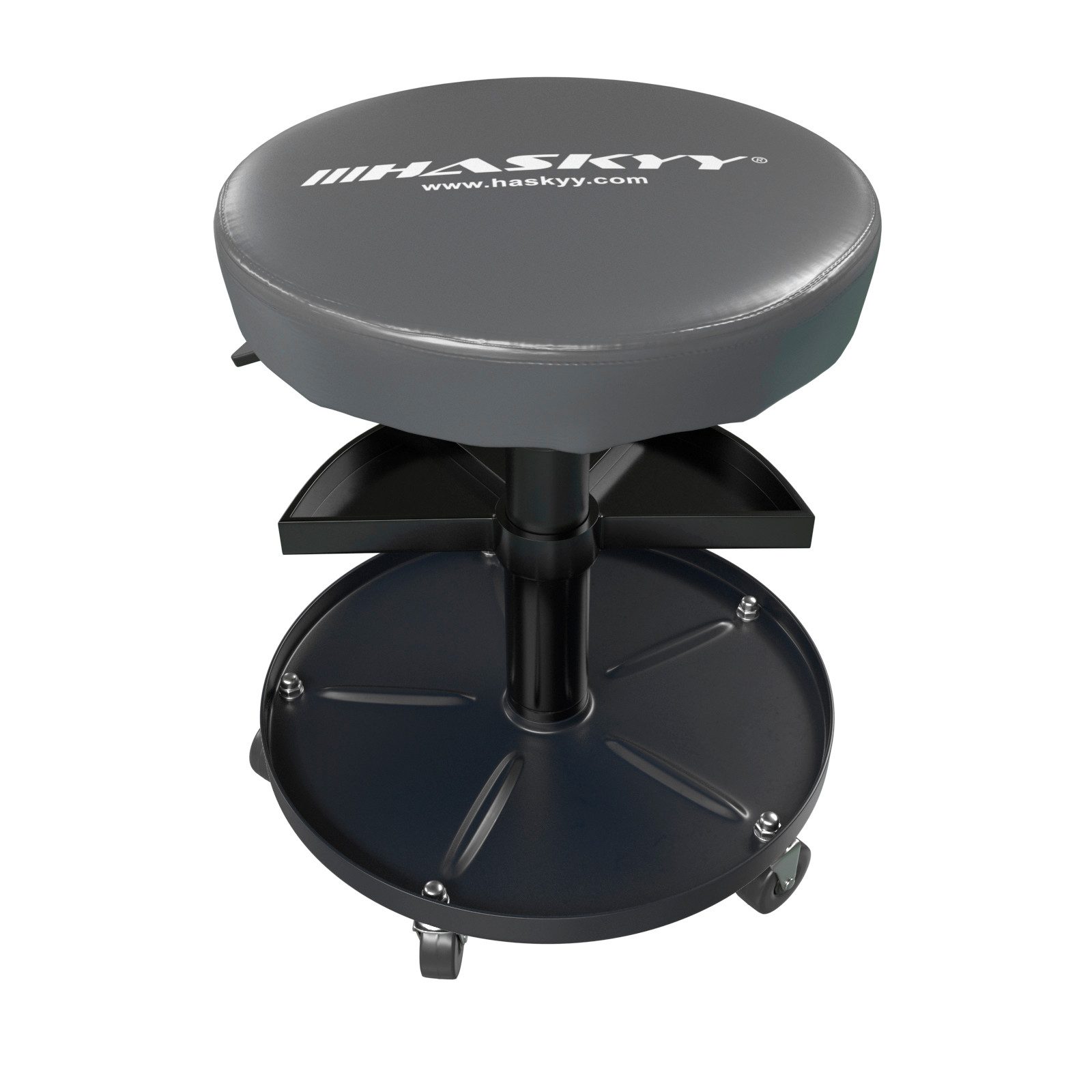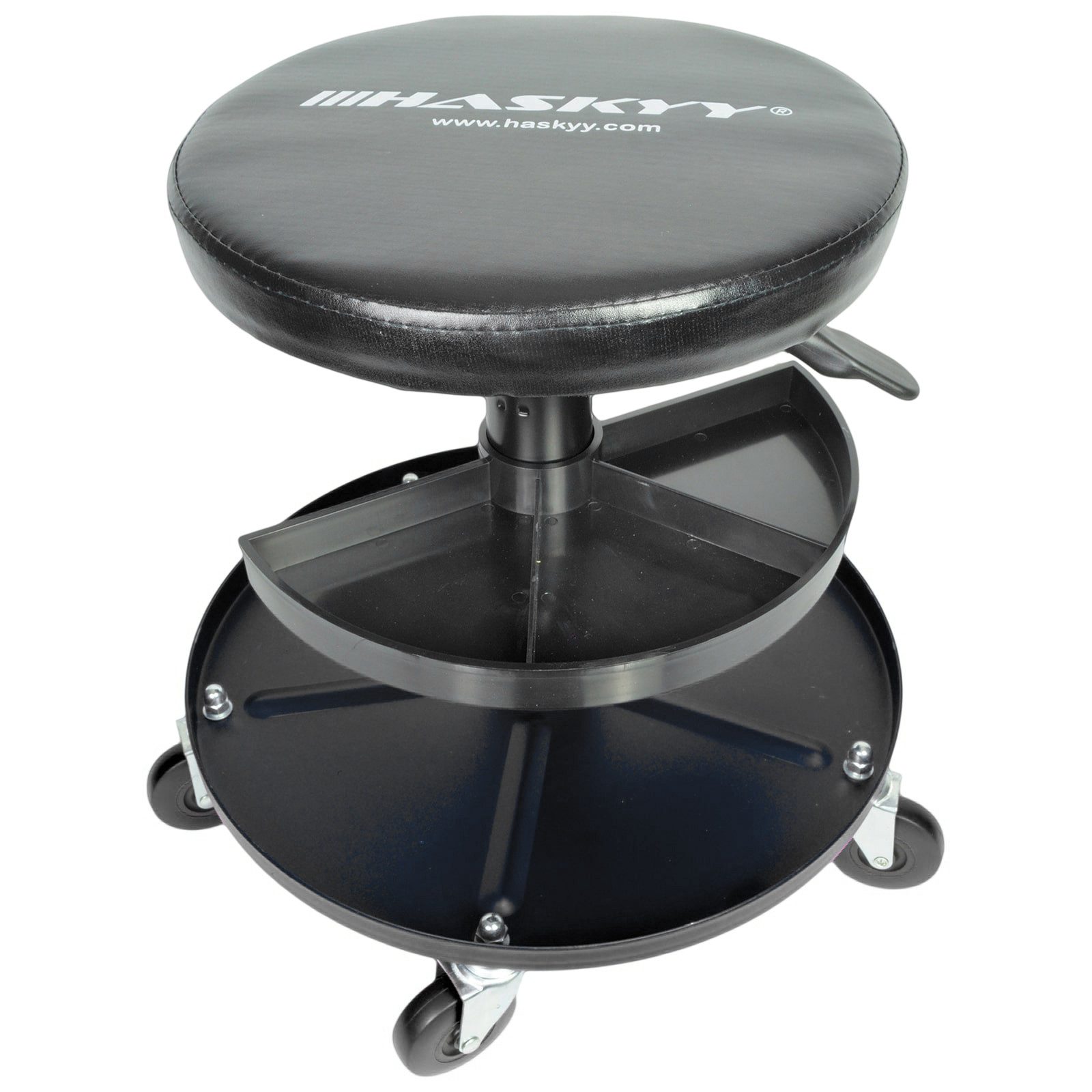 HASKYY Werkstatthocker Rollhocker | Höhe 430-580mm I Sitz Geleinlage | Werkstatt-Arbeits-Hocker-Stuhl-Sitz I 135kg | ø40 cm | 2 Ablagen