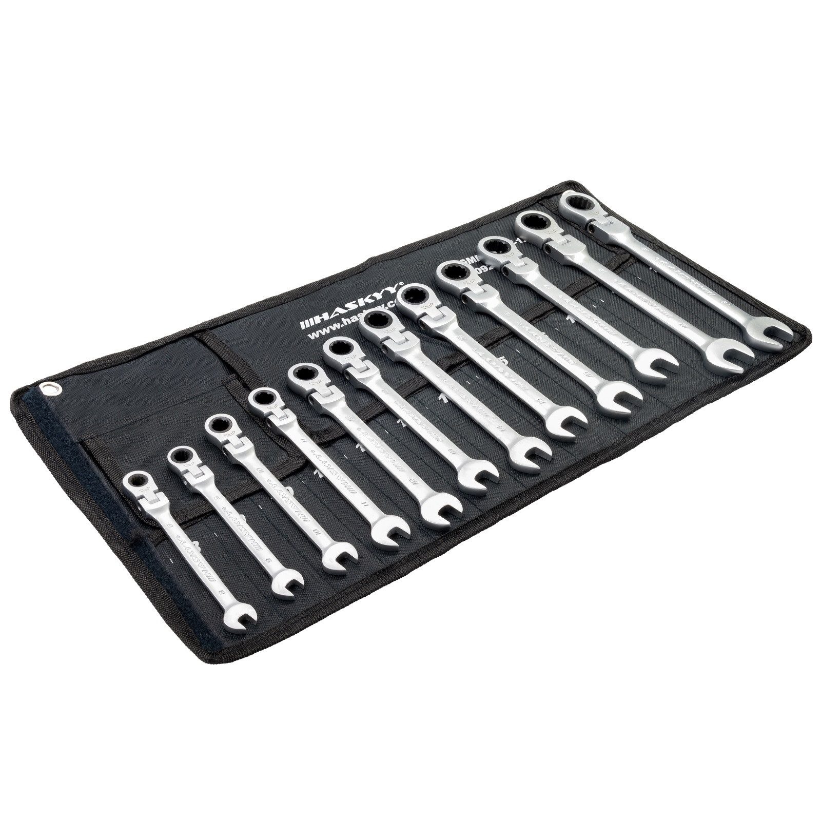 HASKYY 12 tlg. Gelenk Ratschenschlüssel Satz 8-19mmBeschreibung:- folgende Grössen im Set: 8, 9, 10, 11, 12, 13, 14, 15, 16, 17, 18, 19mm- gefertigt aus Chrom Vanadium Stahl- mit Ratschenfunktion für Rechts-/Linkslauf- matt verchromt- Industrie-Qualität- sortiert in praktischerSystemtascheTechnische Info:- Ratsche mit 72 Zähnen (feinverzahnt)- schlanke Bauform- 180° schwenkbarer Ratschen-Ringkopf