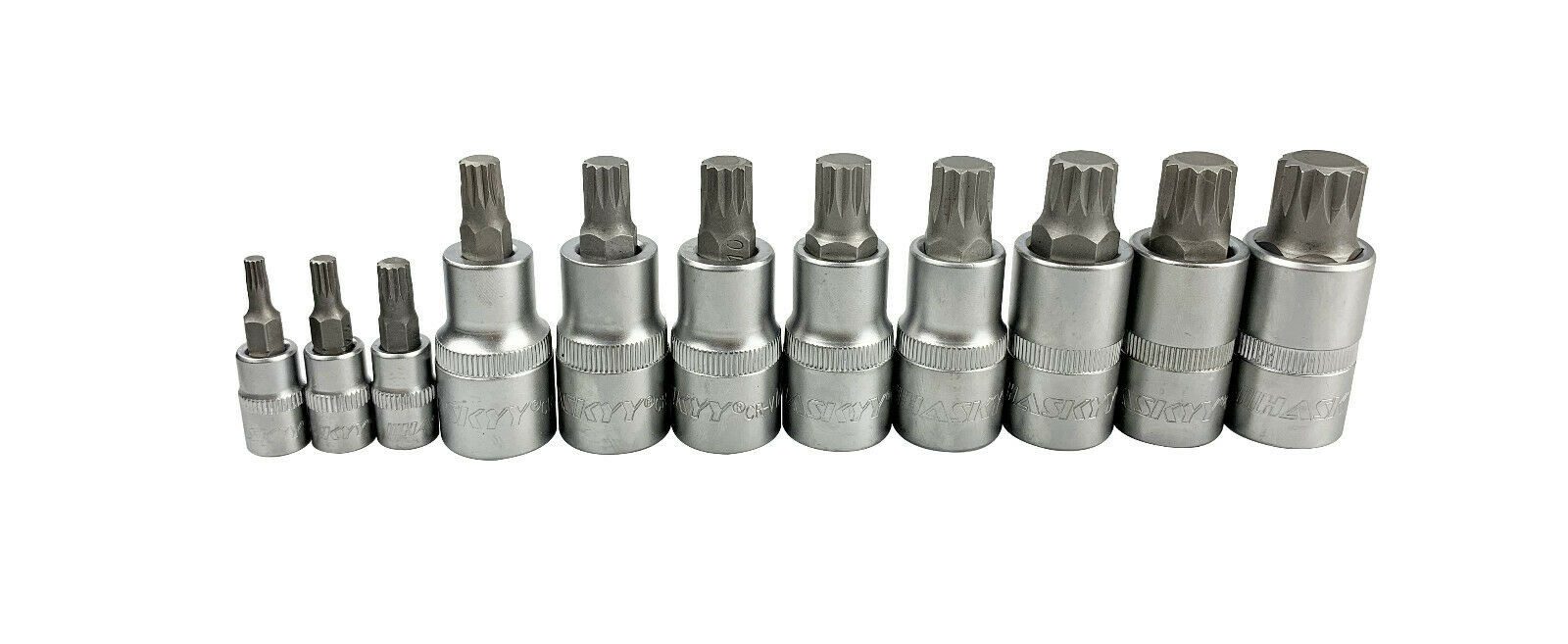 Der HASKYY 11-teilige Steckschlüsselsatz Innenvielzahn ist ein unverzichtbares Werkzeugset für Profis und Heimwerker gleichermaßen. Die Steckschlüssel sind aus hochwertigem Chrom-Vanadium-Stahl gefertigt, der eine hohe Festigkeit und Langlebigkeit gewährleistet. Die präzise gefertigten Innenvielzahn-Steckschlüssel sorgen für einen sicheren Halt an den Schraubenköpfen und minimieren das Risiko von Beschädigungen.