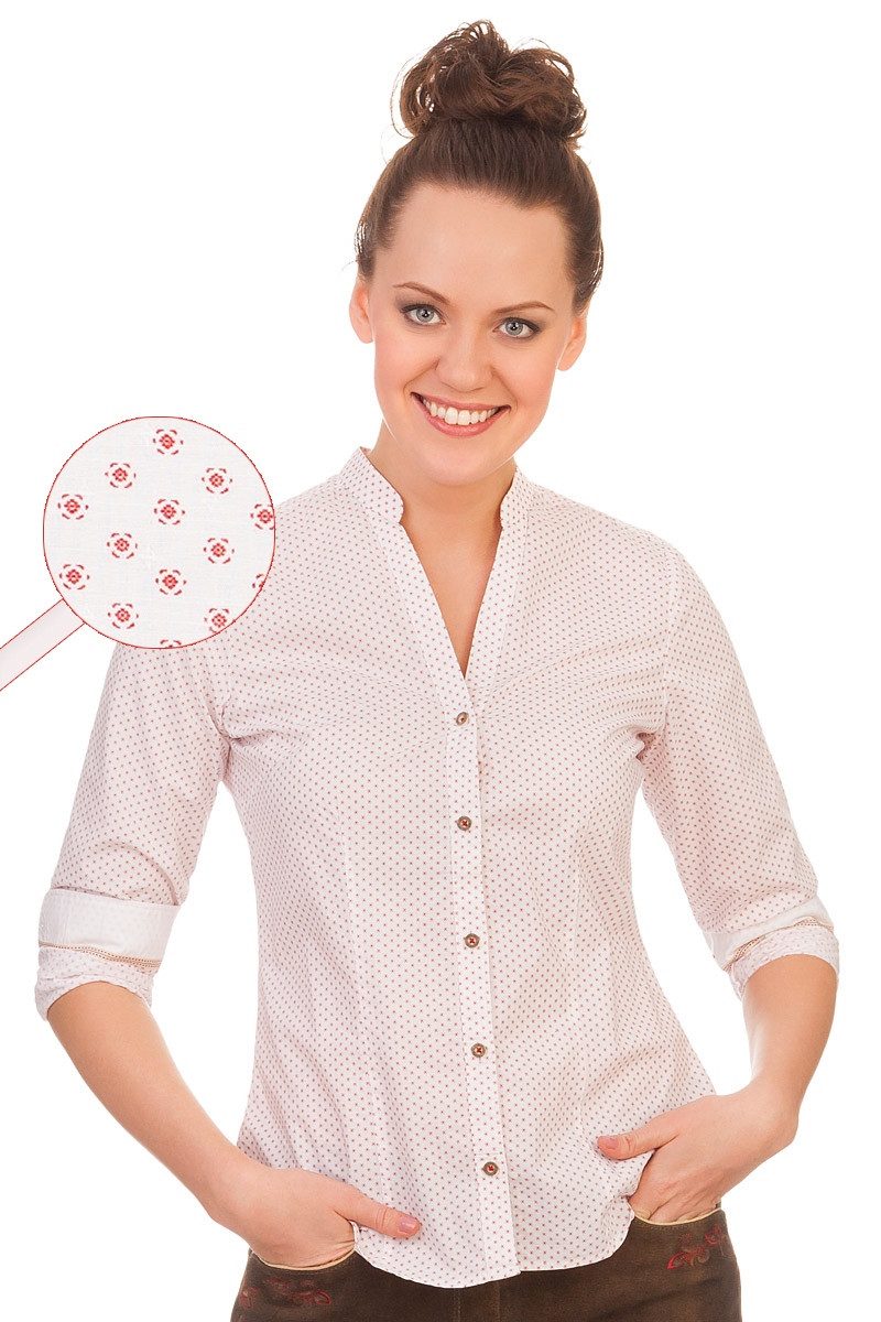 Die schöne langarm Trachtenbluse Daiane besteht aus reiner Baumwolle und ist tailliert im Slim Fit-Schnitt gefertigt. Das zarte Print-Muster in Form kleiner, stilisierter Blüten auf weißem Grund und der angenehme Tragekomfort machen die Damenbluse mit schickem Stehkragen zu einem vielseitigen Begleiter. Der kleine V-Ausschnitt geht in eine mit Knöpfen in uriger Hirschhorn-Optik bestückte Knopfleiste über. Die weitenregulierbaren Manschetten, der Nackenbereich sowie der Kragen sind verstärkt. Zudem ziert eine Borte den Kragen innen. Der Saum ist leicht gewölbt. Die hinreißende Bluse im bezaubernd-sportlichen Design stammt aus dem Hause Pure.