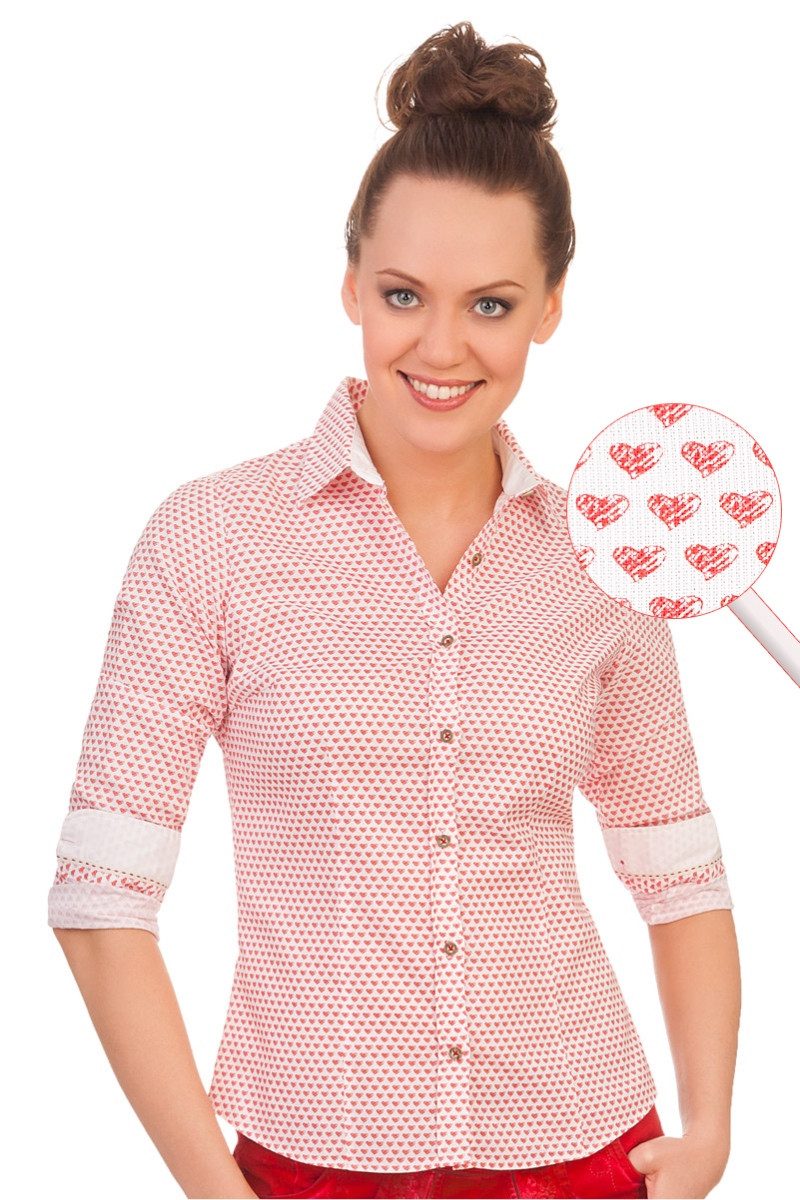 Die bezaubernde, tailliert geschnittene Trachtenbluse Darline besteht aus reiner Baumwolle, ist zart strukturiert und mit tausenden, niedlichen Herzen bedruckt. Sie hat lange Ärmel, weitenverstellbare Manschetten und einen schönen, innen verstärkten Kentkragen. Der Nackenbereich ist ebenfalls verstärkt und der Saum leicht gewölbt. Die Knöpfe in rustikaler Hirschhorn-Optik komplettieren das romantisch-sportliche Design von der Marke Pure. Durch den angenehmen Tragekomfort und das süße Printmuster wird die Damenbluse zum perfekten Begleiter für viele Anlässe. Unser Model ist 1,75 m groß und trägt Размер S. Длина gemessen an Referenzgröße S (ohne Kragen): ca. 61 cm