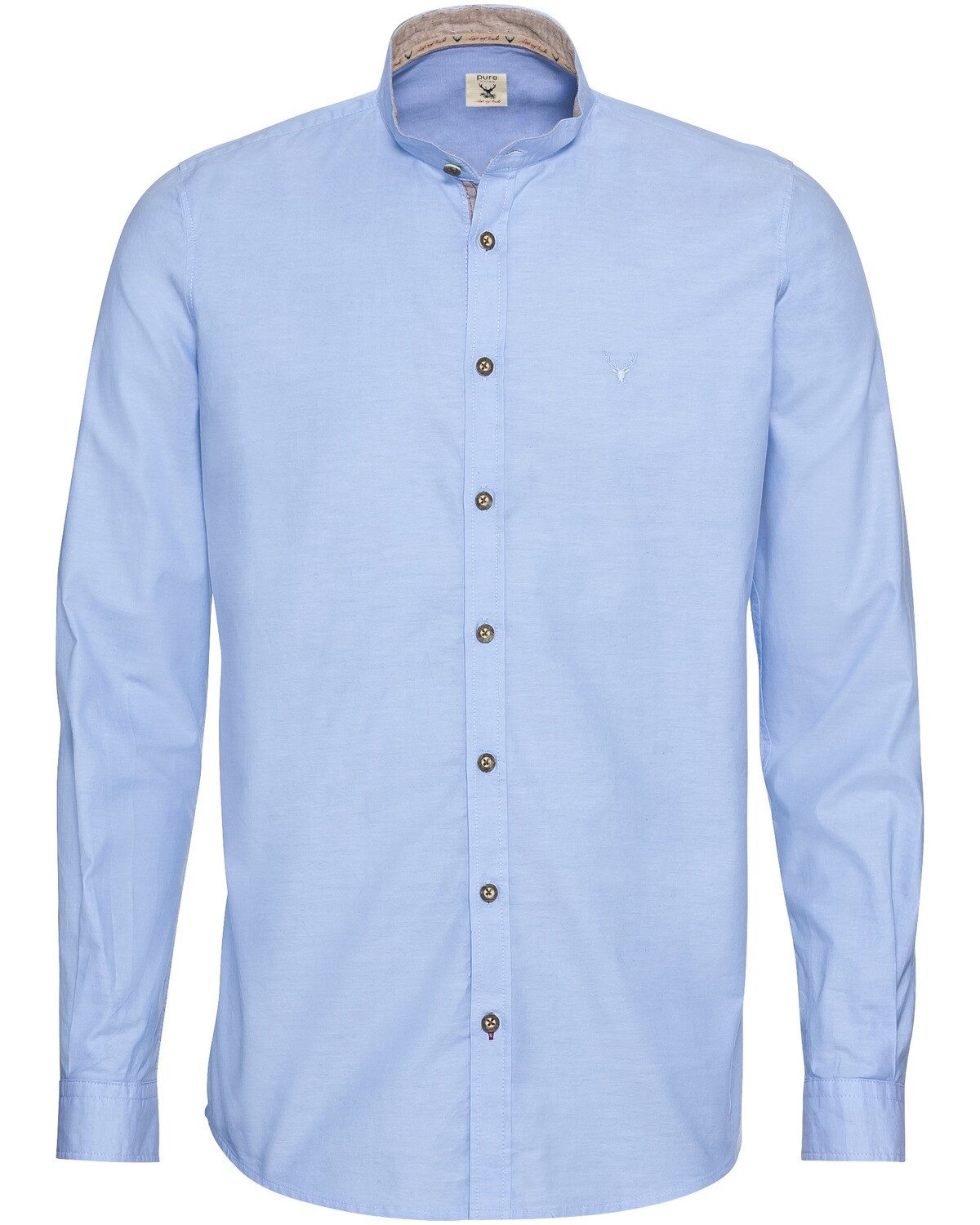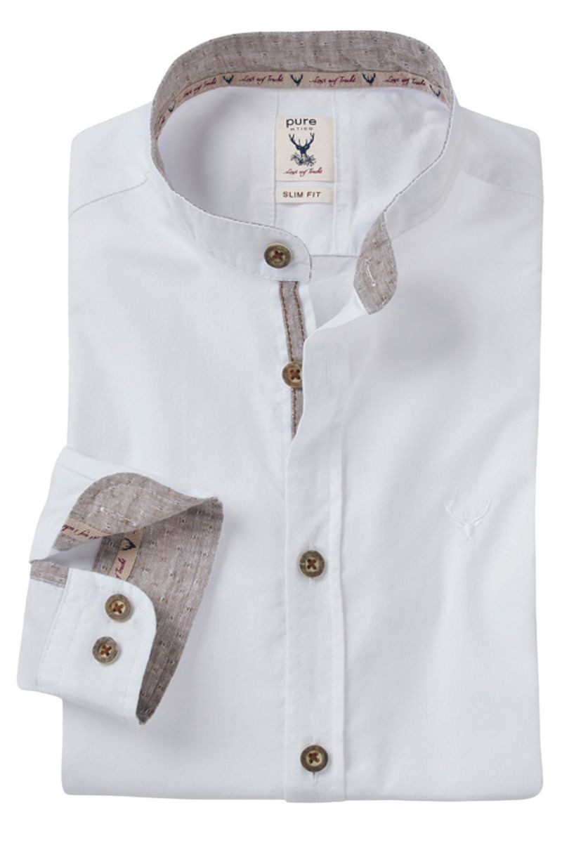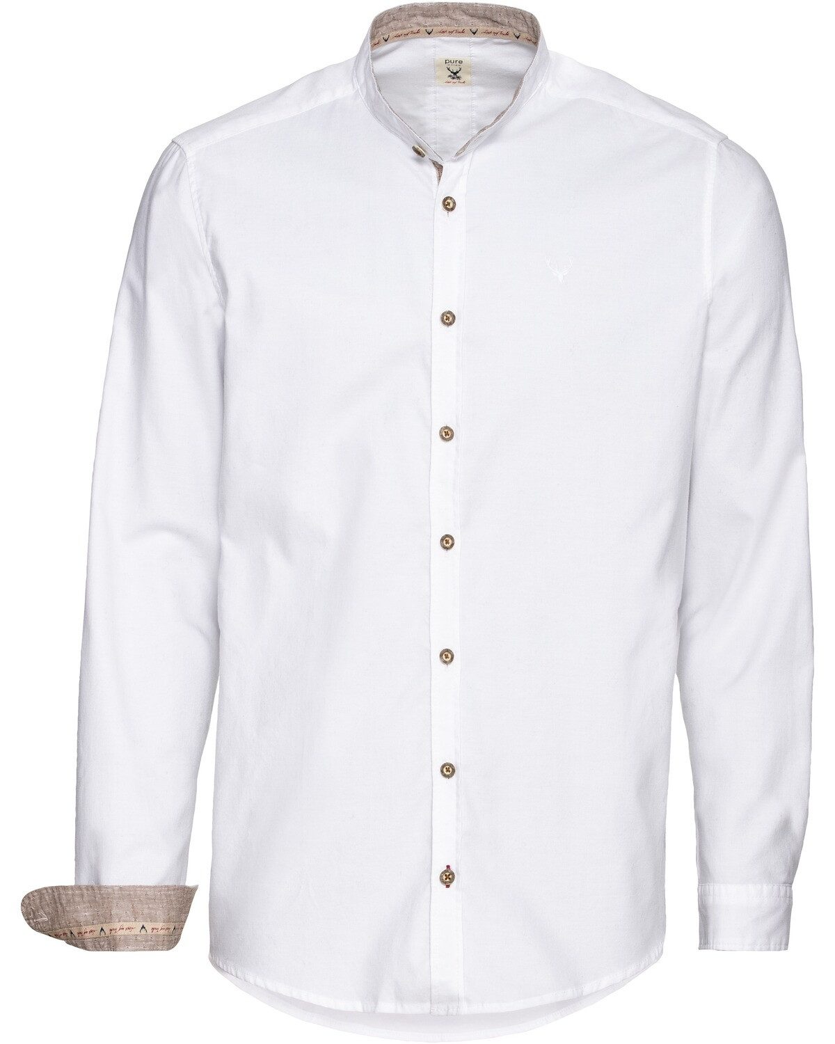 Franco, das vielseitige Trachtenhemd aus feiner Baumwolle mit Stretch-Anteil von pure, wird im leicht taillierten Slim Fit-Schnitt gefertigt, hat dezent betonte, leicht glänzende Nähte in Hellbeige, lange Ärmel und einen schicken Stehkragen. Der Kragen ist innen mit Kontraststoff im Leinen-Look verstärkt und mit einer Stoffborte verziert. In Brusthöhe links gibt es eine kleine Hirschkopf-Stickerei in Weiß. Die verstärkte, mit Knöpfen im krachigen, stilisierten Hirschhorn-Stil bestückte Knopfleiste ziert eine Stoffborte in Leinen-Optik und unten befindet sich ein kleiner, textiler Marken-Aufnäher. Auch die Knopflochleiste ist verstärkt und dezent abgesetzt. Die durch zwei Knöpfe weitenregulierbaren Manschetten der langen Ärmel sind abgerundet und innenseitig mit naturfarbenem Kontraststoff im Leinen-Style verstärkt sowie mit einer Stoffborte geschmückt. Ein Kontraststoff-Saum verstärkt die Ärmelschlitze mit Knopf. Der Hemdsaum ist leicht abgerundet. Rückseitig verfügt das Hemd über einen Locker Loop aus Stoffborte mit Markenname. Das schöne, universelle Herrenhemd in angenehm weicher Stoffqualität bietet einen herrlichen Tragekomfort und lässt sich super zur Trachten Lederhose und -Jeans kombinieren.