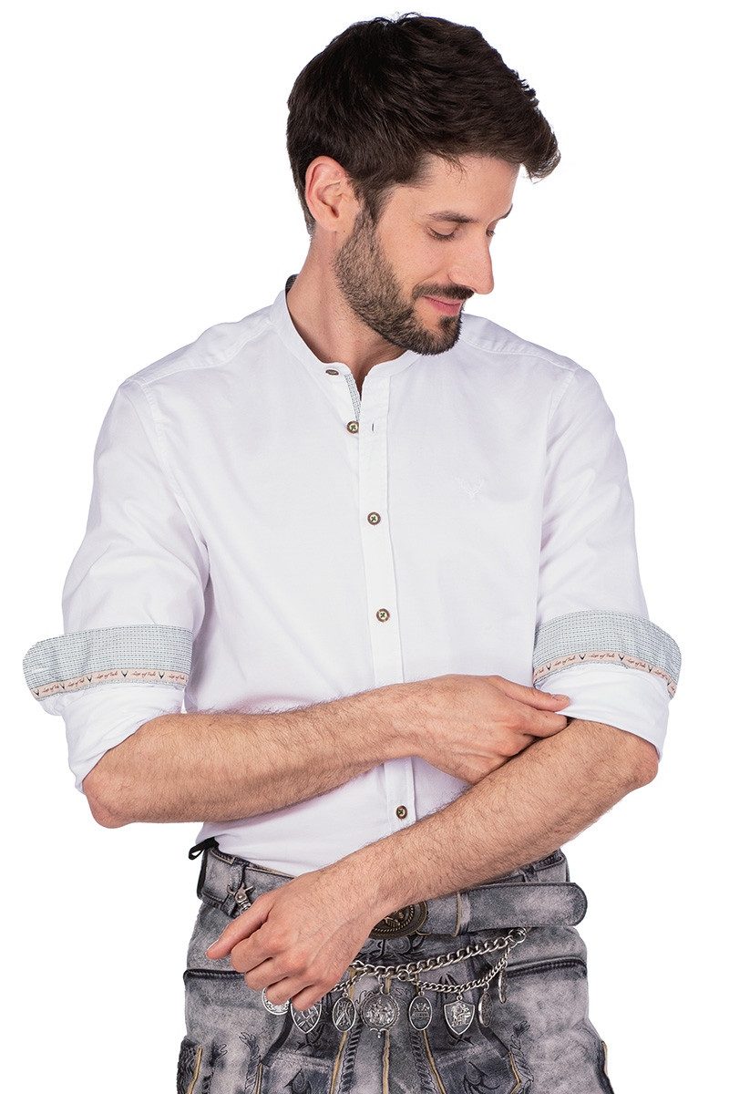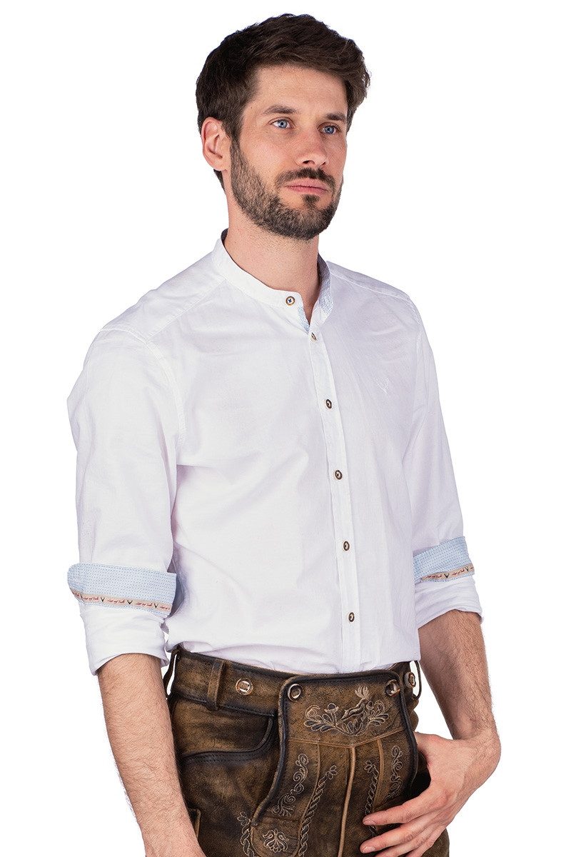 Das tolle Herren Trachtenhemd "Miko" im leicht taillierten Slim Fit-Schnitt besteht aus schöner, angenehmer Baumwolle mit Stretch-Anteil in Leinwandbindung-Art und hat eine luftig-leichte Stoffqualität. Der Stehkragen ist innen mit Kontraststoff verstärkt. Auf der linken Brust ziert eine Hirschkopf-Stickerei in Weiß das Herrenhemd. Die Knopfleiste ist schmal mit Kontraststoff umsäumt, die Knopflochleiste dezent abgesetzt. Abgerundete Manschetten, innen verstärkt mit Kontraststoff und Marken-Stoffborte, sind durch zwei Knöpfe weitenregulierbar und der verstärkte Ärmelschlitz ist mit einem Knopf versehen. Die Knöpfe im rustikalen Hirschhorn-Look sind farbig vernäht, was dem Hemd eine besondere Note verleiht. Unten an den Seitennähten befinden sich Stockzwickel aus Kontraststoff. Der Kontraststoff mit klitzekleinen Rauten und Strichen in Dreiergruppen in Blau bzw. Grün setzt stilvolle Akzente. Im Nackenbereich ist ein Locker Loop aus Marken-Stoffborte angebracht, der Saum ist leicht gewölbt. Dieses Trachtenhemd ist fantastisch zu Lederhose und Trachtenjeans kombinierbar.