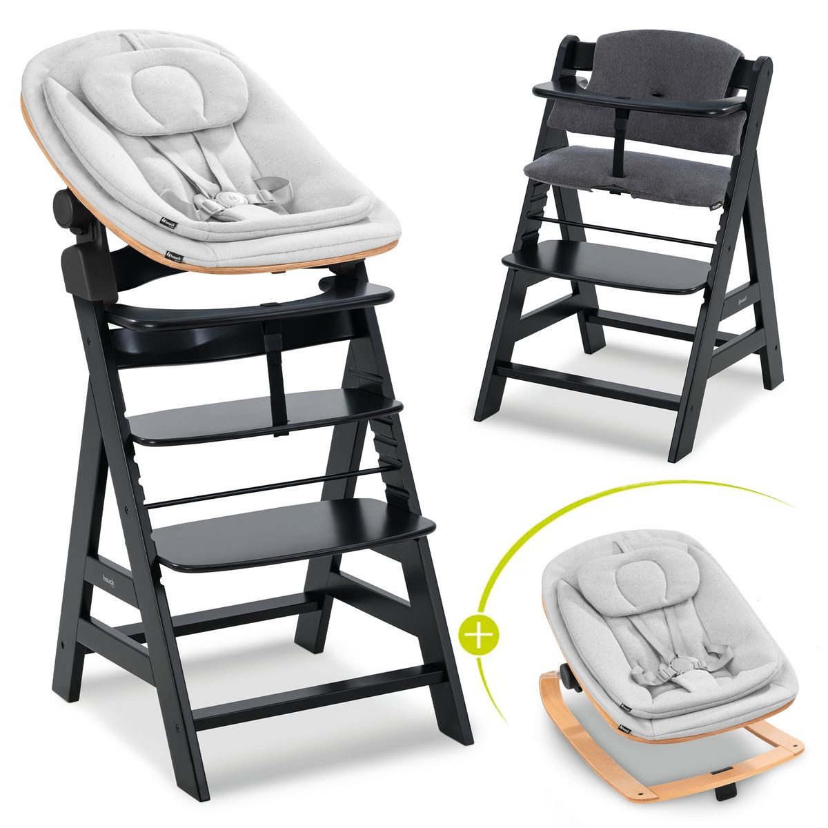 Lieferumfang | Hauck Hochstuhl Alpha Plus - Black Schutzbügel Schrittgurt Hauck Neugeborenenaufsatz & Wippe Highchair Bouncer Eco - Light Grey kuscheliger Sitzverkleinerer weiche Kopfstütze Holz-Gestell für Nutzung als Babywippe Adapter für Hochstuhl Alpha und Beta Hauck Hochstuhlauflage Deluxe - Select Line - Jersey Charcoal |