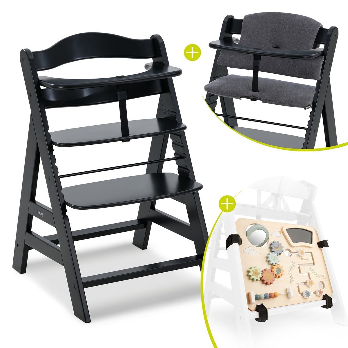 Mit dem Hochstuhl Alpha Plus Black im Sparset inkl. Sitzkissen und Motorik-Spielbrett Play Board von Hauck erhältst Du eine durchdachte Kombination aus sicherem Sitzplatz und kreativem Spielbereich. Der mitwachsende Hochstuhl aus stabilem Buchenholz wächst mit Deinem Kind mit und bietet durch die verstellbare Sitz- und Fußplatte eine ergonomische Sitzposition in jeder Wachstumsphase.