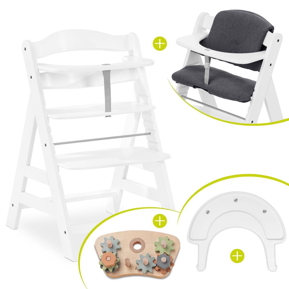 Lieferumfang | Alpha Plus Hochstuhl, Schutzbügel, Schrittgurt, 5-Punkt-Gurtsystem, Hauck Sitzverkleinerer Highchairpad Select in Jersey Charcoal, Hauck Play Tray Basis für Alpha & Beta Hochstuhl, Hauck Play Repairing - Gears & Nuts |