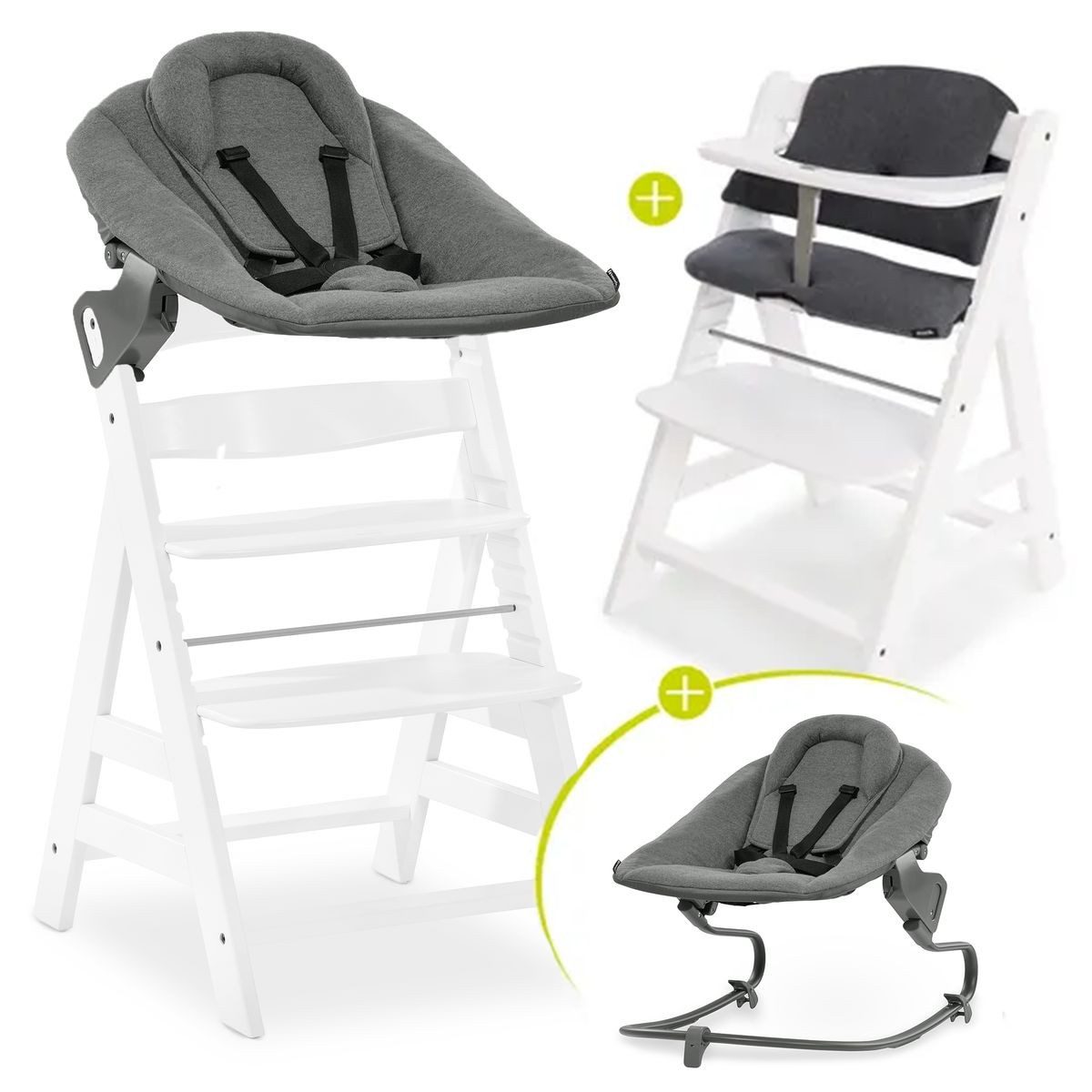 Lieferumfang | Alpha Plus Hochstuhl - White Alpha Bouncer 2in1 Premium - Neugeborenenaufsatz & Wippe Sitzverkleinerer für Neugeborenenaufsatz 2-teilige Sitzauflage Jersey Charcoal |