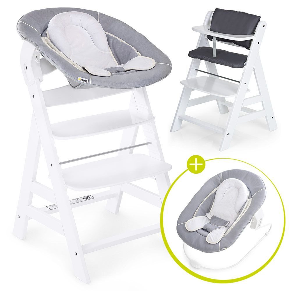 Lieferumfang | Hochstuhl Alpha Plus White 2-teilige Sitzauflage 5-Punkt-Gurtsystem Newborn Aufsatz Stretch Grey Schrittgurt Schutzbügel Sitzverkleinerer für Neugeborene Wippengestell |