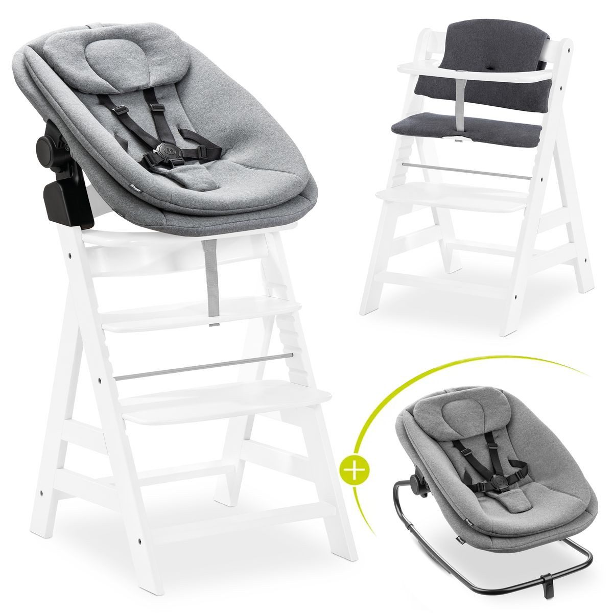 Lieferumfang | Hauck Hochstuhl Alpha Plus - White Schutzbügel Schrittgurt 5-Punkt-Gurtsystem Hauck Neugeborenenaufsatz & Wippe Highchair Bouncer - Dark Grey Melange Neugeborenen-Einlage 5-Punkt-Gurt Adapter für Alpha+ Hauck Hochstuhlauflage Deluxe - Select Line - Jersey Charcoal |