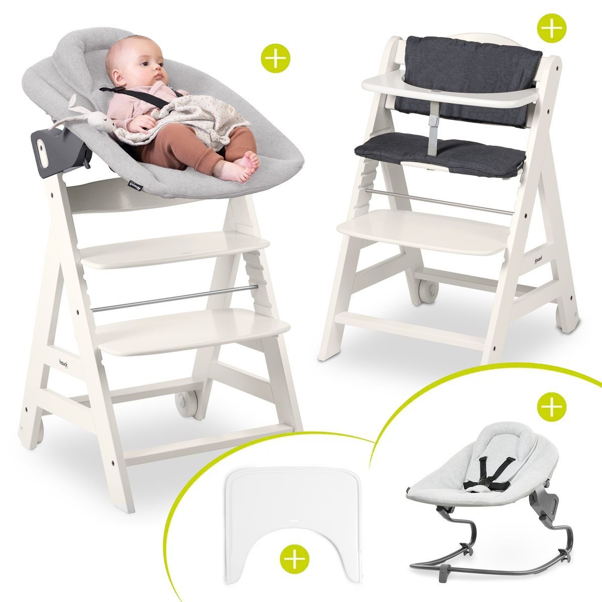 Lieferumfang | Hauck Beta Plus Hochstuhl - White Bouncer 2in1 Premium - Neugeborenenaufsatz & Wippe - Light Grey Sitzverkleinerer mit Kopfschutz Gestell für Babywippe Ess- & Spielbrett Kissen für Rückenlehne und Sitzfläche Schutzbügel und Durchrutschschutz (Baby-Set) 5-Punkt Gurt Haltesystem 2 Rollen (als Kippschutz) |