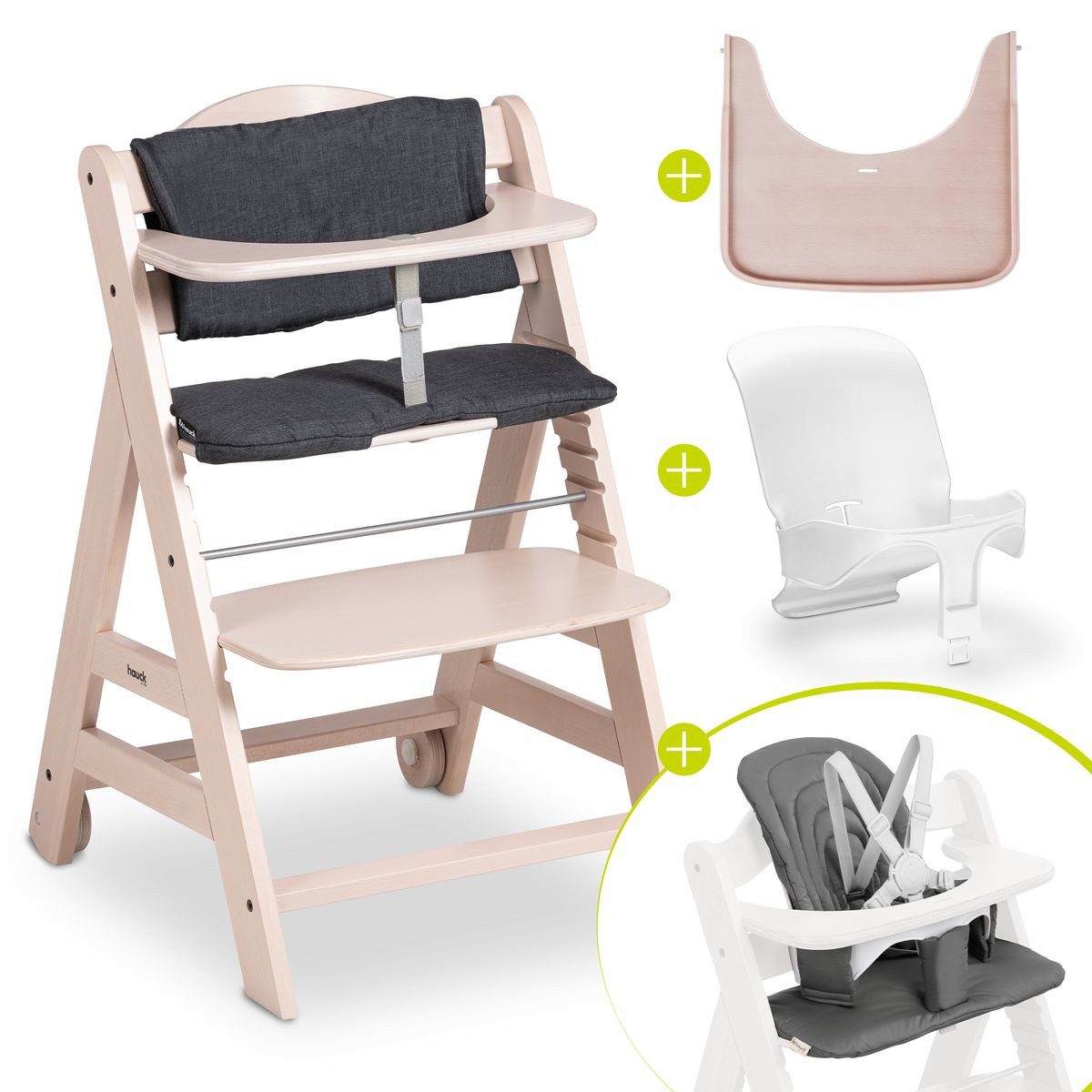 Lieferumfang | Hauck Hochstuhl Beta Plus - Whitewashed Essbrett aus Buchenholz Schutzbügel Schrittgurt 5-Punkt-Sicherheitsgurt 2-teiliges Sitzpolster Hauck Highchair Baby Seat - White Hauck Sitzkissen für Highchair Baby Seat - Dark Grey |