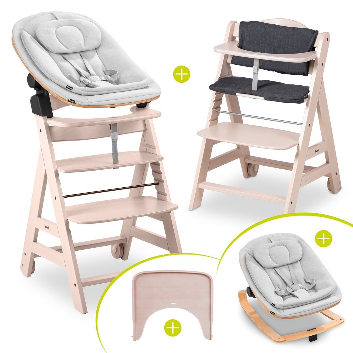 Lieferumfang | Hauck Hochstuhl Beta Plus - Whitewashed Essbrett aus Buchenholz Schutzbügel 2-teiliges Sitzpolster 5-Punkt Gurt Hauck Highchair Bouncer Hochstuhl-Aufsatz - Light Grey kuscheliger Sitzverkleinerer weiche Kopfstütze Holz-Gestell für Nutzung als Babywippe Adapter für Hochstuhl Alpha und Beta |