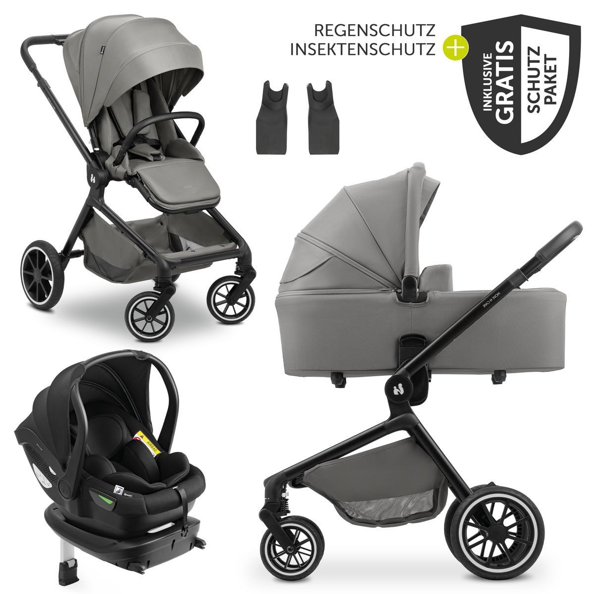 Durchdachtes Zubehör: Im Set enthalten sind Regenschutz und Insektenschutz für Kinderwagen und Babyschale. Sie sind pflegeleicht, einfach zu befestigen und bieten Schutz bei jedem Wetter – ein zuverlässiges Komplettpaket für mobile Familien.