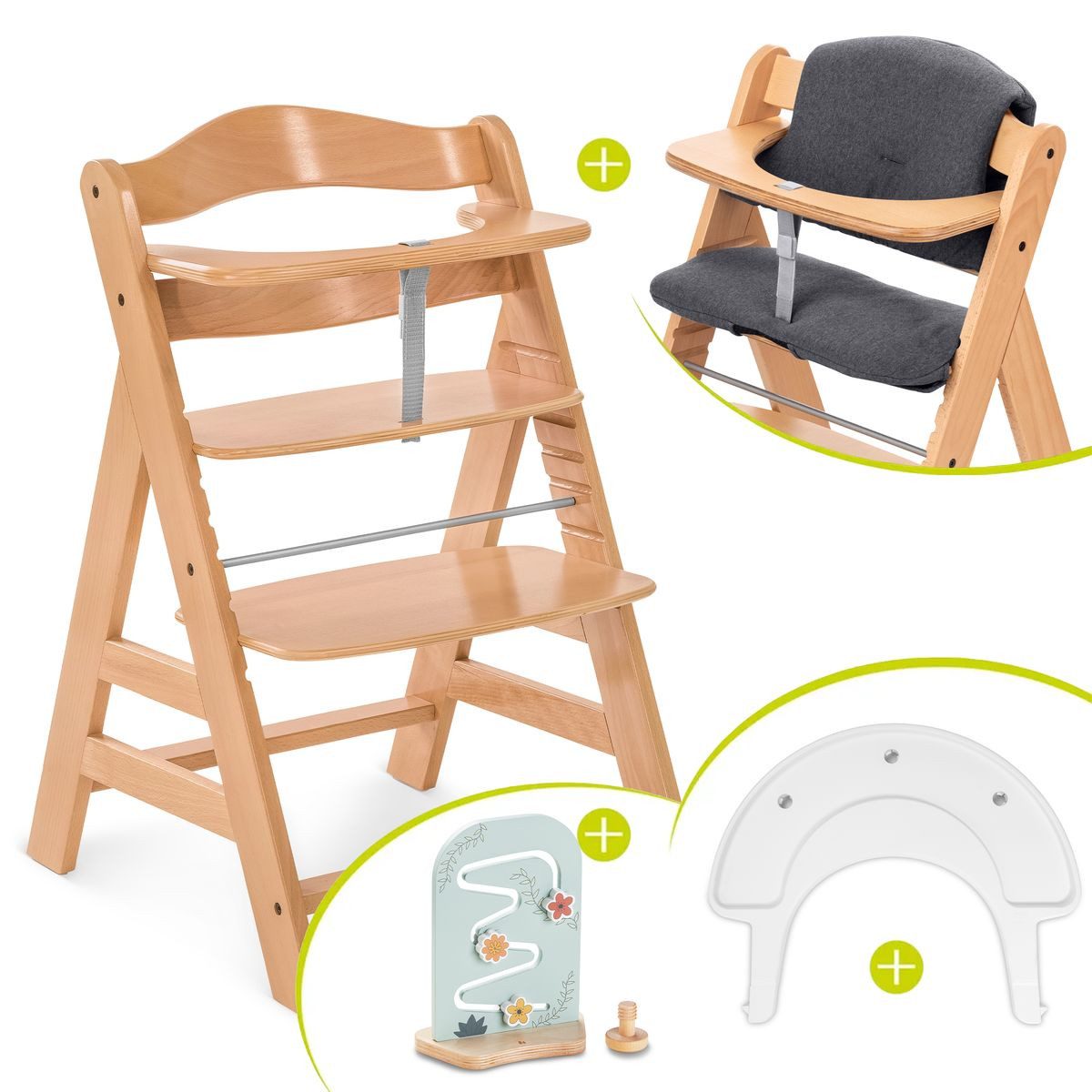 Lieferumfang | Hauck Alpha Plus Hochstuhl, Schutzbügel, Schrittgurt, 5-Punkt-Gurtsystem, Hauck Sitzverkleinerer Highchairpad Select in Jersey Charcoal, Hauck Play Tray Basis für Alpha & Beta Hochstuhl, Hauck Play Planting - Flowers |