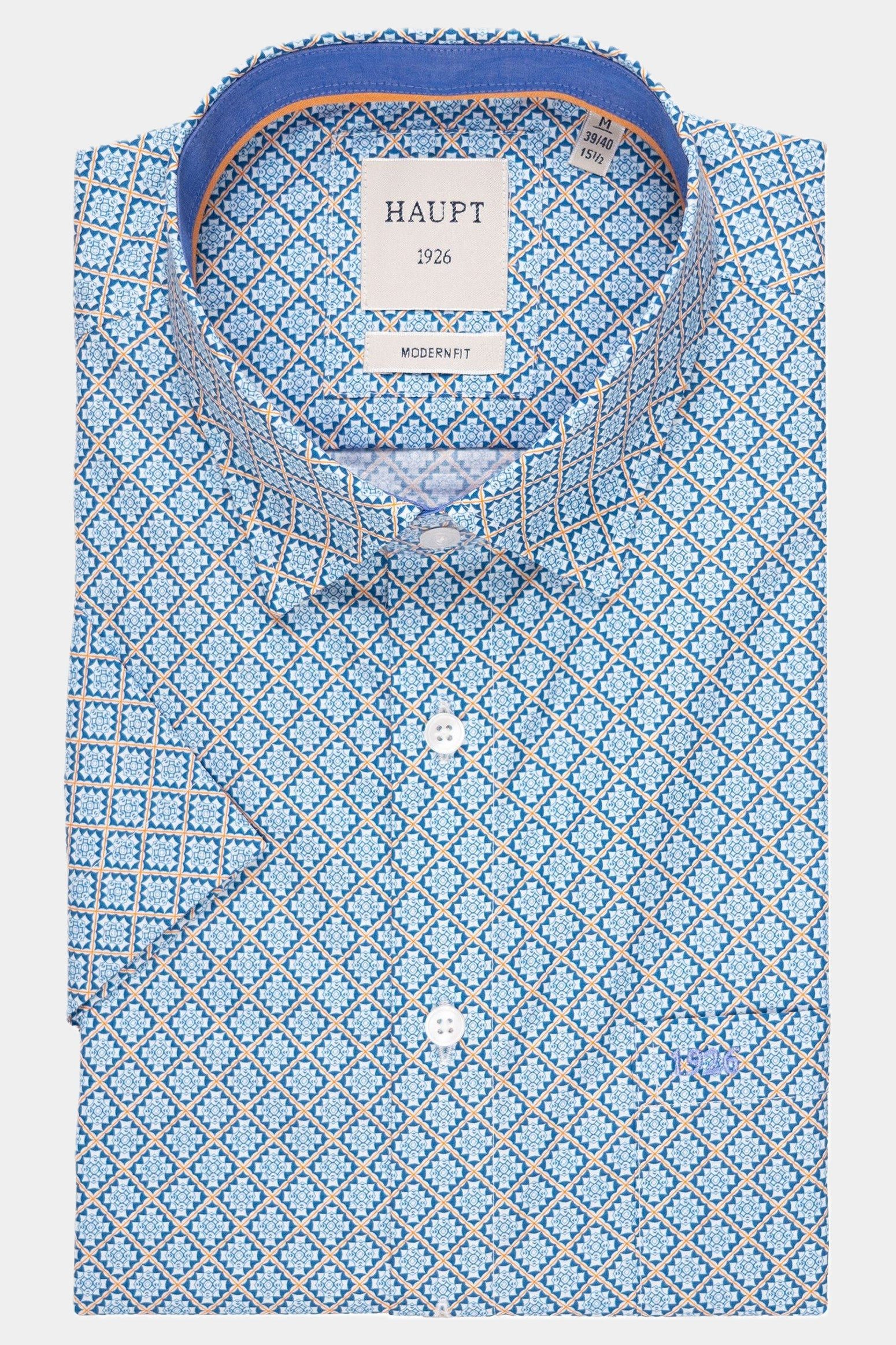 Dieses Kurzarmhemd von der Marke Haupt überzeugt durch sein stilvolles All-Over-Print-Design in Jeansblau und einen modernen, körpernahen Schnitt (Modern Fit). Aus leichtem, atmungsaktivem Material gefertigt, ist es der perfekte Begleiter für warme Tage – ob im Büro, in der Freizeit oder im Urlaub. Die praktische Brusttasche rundet das Design funktional ab.