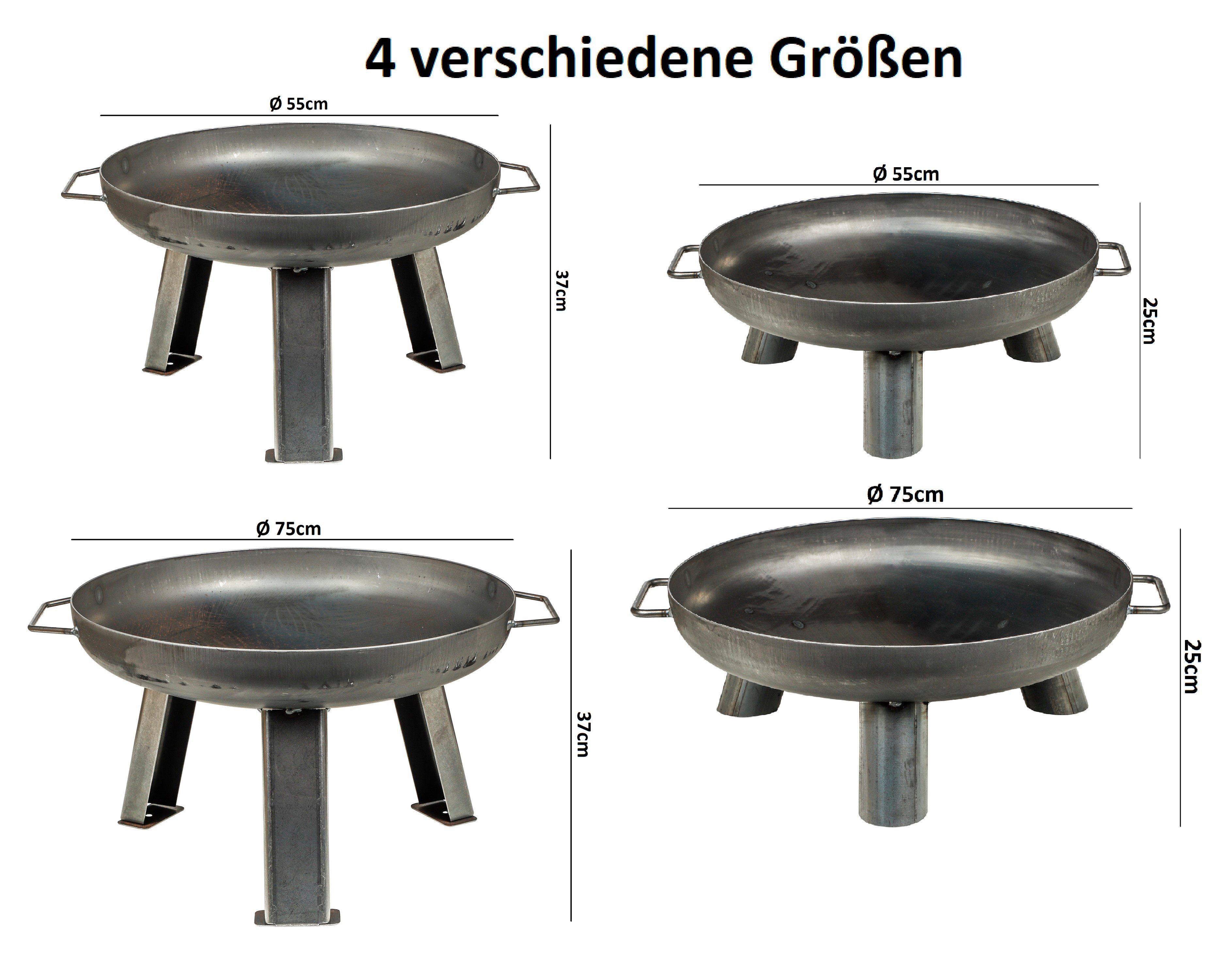 Die Feuerschale wird aus unbehandeltem Stahl hergestellt und ist mit einem Durchmesser von 75cm und 55cm erhältlich. Drei angeschweißte Füße bieten ihr einen sicheren und zuverlässigen Stand. Dank zwei seitlich angebrachten Tragegriffen kann die Feuerschale einfach und bequem transportiert werden. Eine schwarze Graphitbeschichtung dient als ungiftiges Schmier-, Frostschutzmittel und als Korrosionsschutz. Mit der Zeit bildet sich eine natürliche Rostpatina. Je mehr die Feuerschale der Witterung ausgesetzt ist, desto schneller ist dieser Prozess. Bei Nichtgebrauch sollte die Feuerschale witterungsgeschützt untergebracht werden, da sie bei Regen und Sonne schneller zu rosten anfängt. Die Pflege der Feuerschale mit haushaltsüblichem Speiseöl (Bsp. Lein- oder Sonnenblumenöl) kann die Bildung von Rost verlangsamen. Dafür das Öl mit einem Lappen außen und innen in die zuvor gereinigte, kalte Schale aufbringen. Bitte beachten Sie: Die Bildung von Rost lässt sich trotzdem nicht verhindern. Eigenschaften: Material: Metall