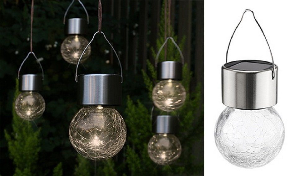 Mit diesem Hängeleuchten-Set bringen Sie Akzente in Ihrem Garten. Durch die Bruchglasoptik entstehen wunderschöne Lichtreflexe. Die warmweißen LEDs erzeugen ein gemütliches Stimmungslicht.