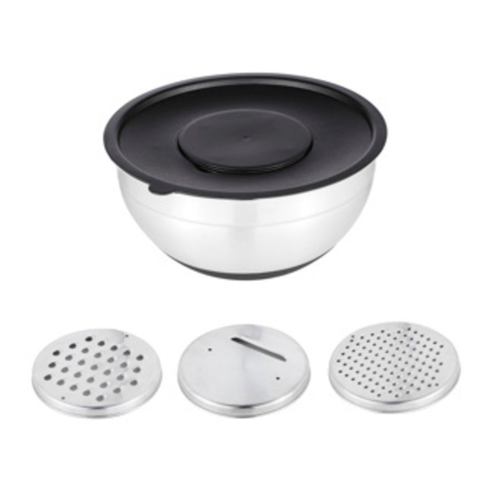 Material: Schüssel: Edelstahl Reiben: Edelstahl 18/0 Boden: Silikon Materialstärke: 0,45mm Durchmesser: 24cm Verpackung: Schrumpffolie + Sticker