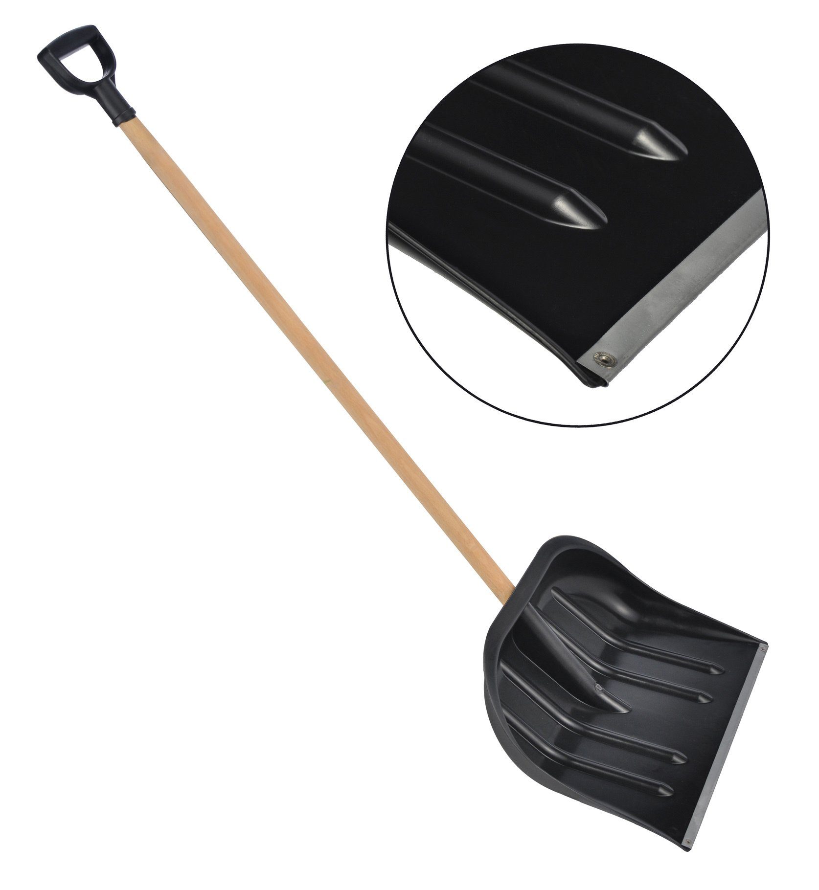 Gesamthöhe: ca. 136,5 cm Schaufel aus frostresistentem Kunststoff mit Kratzkante aus verzinktem Stahl Holzstiel 2,8 cm Durchm., mit Handgriff aus Kunststoff