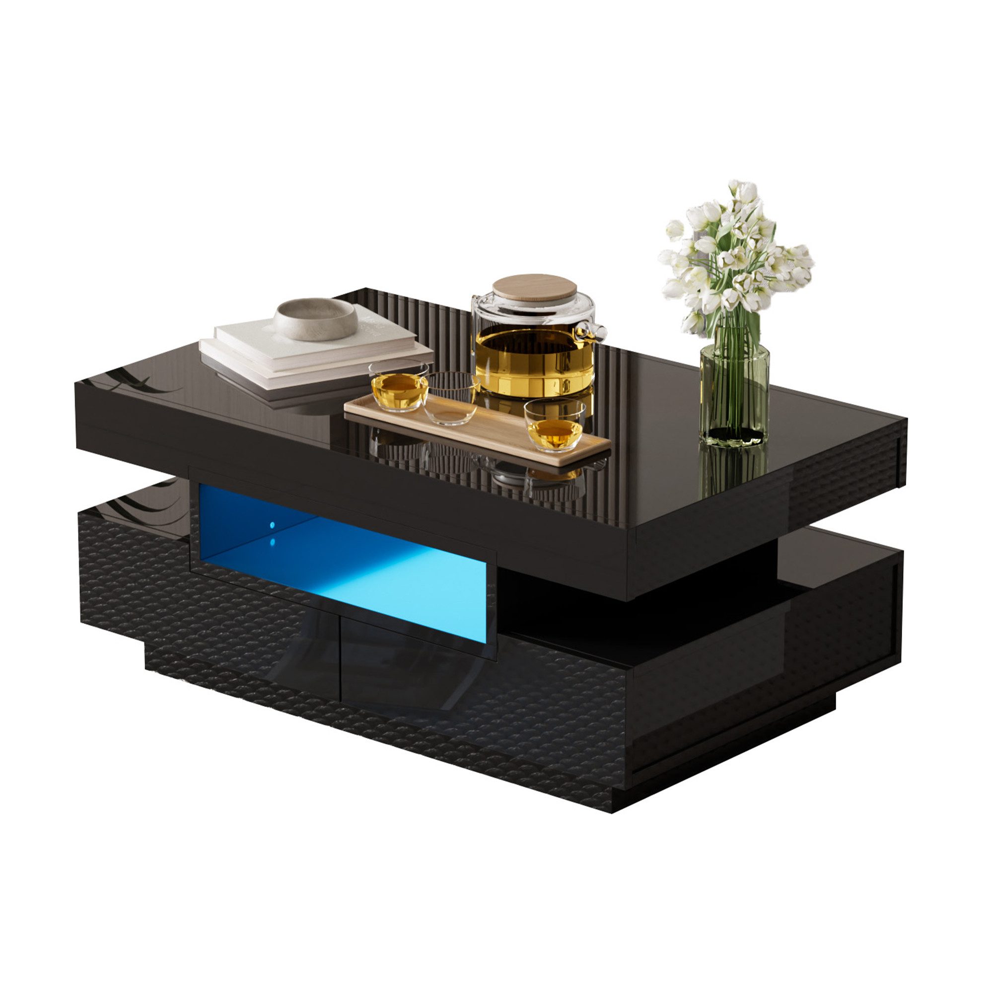 Unser Kaffeetisch kombiniert zeitlose Eleganz mit praktischer Raffinesse und präsentiert sich in großzügigen Abmessungen von 80x50x36 cm. Die integrierte LED-Lichtleiste ermöglicht es Ihnen, die Atmosphäre zu gestalten. Drei offene Fächer und vier Schubladen bieten ausreichend Platz für Bücher.