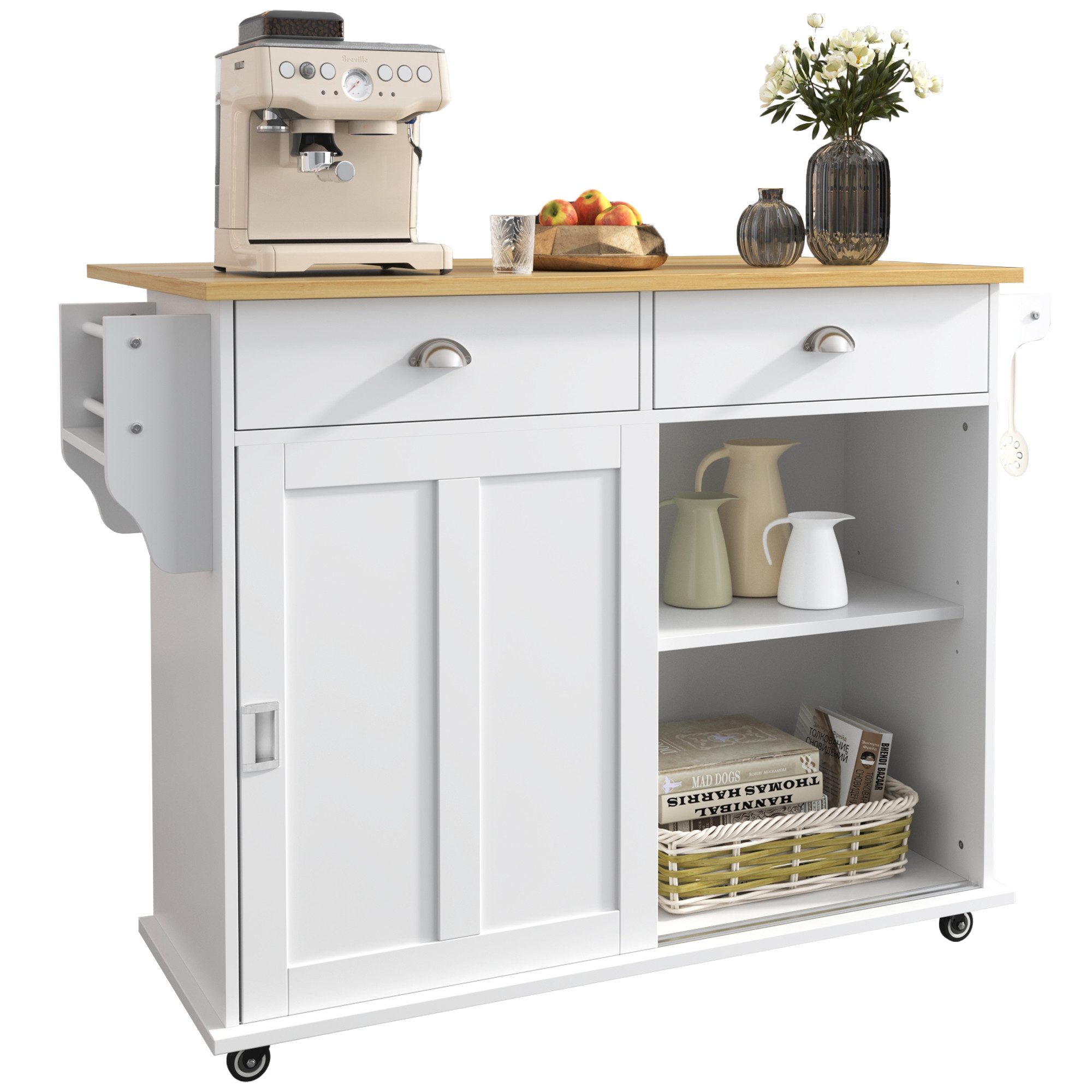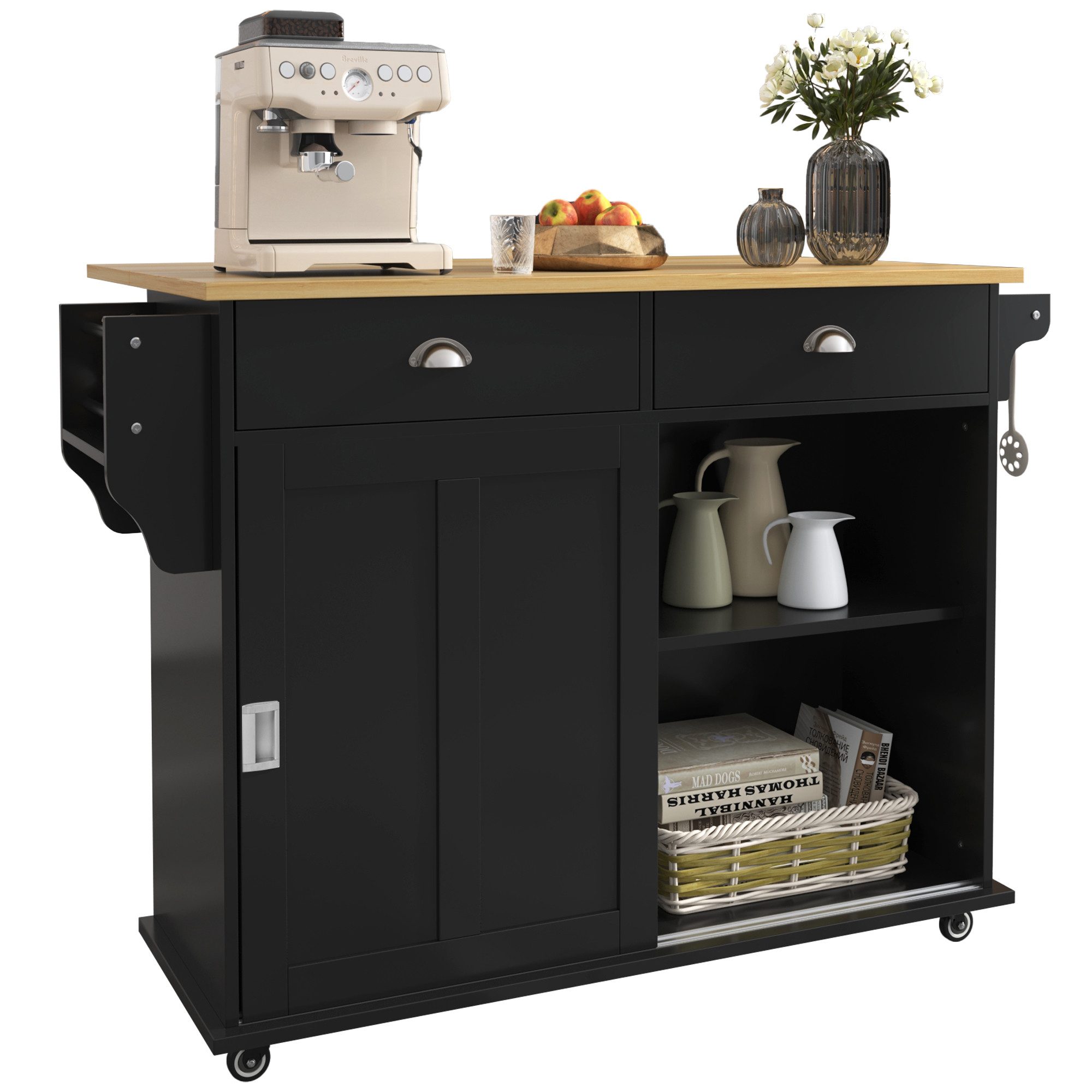 Küchenwagen mit klappbarer Tischplatte und Stauraumregal an der Innenseite der Türen.