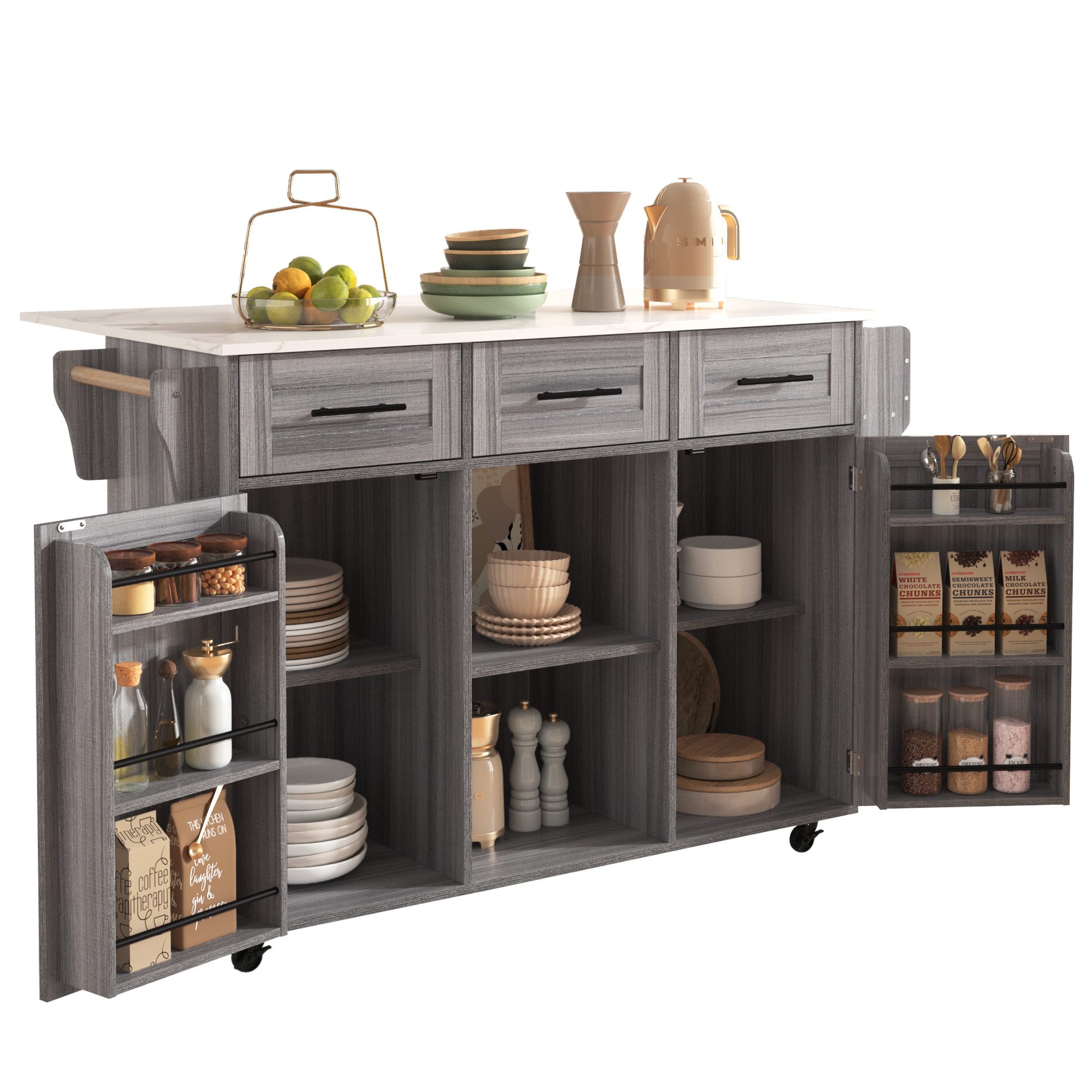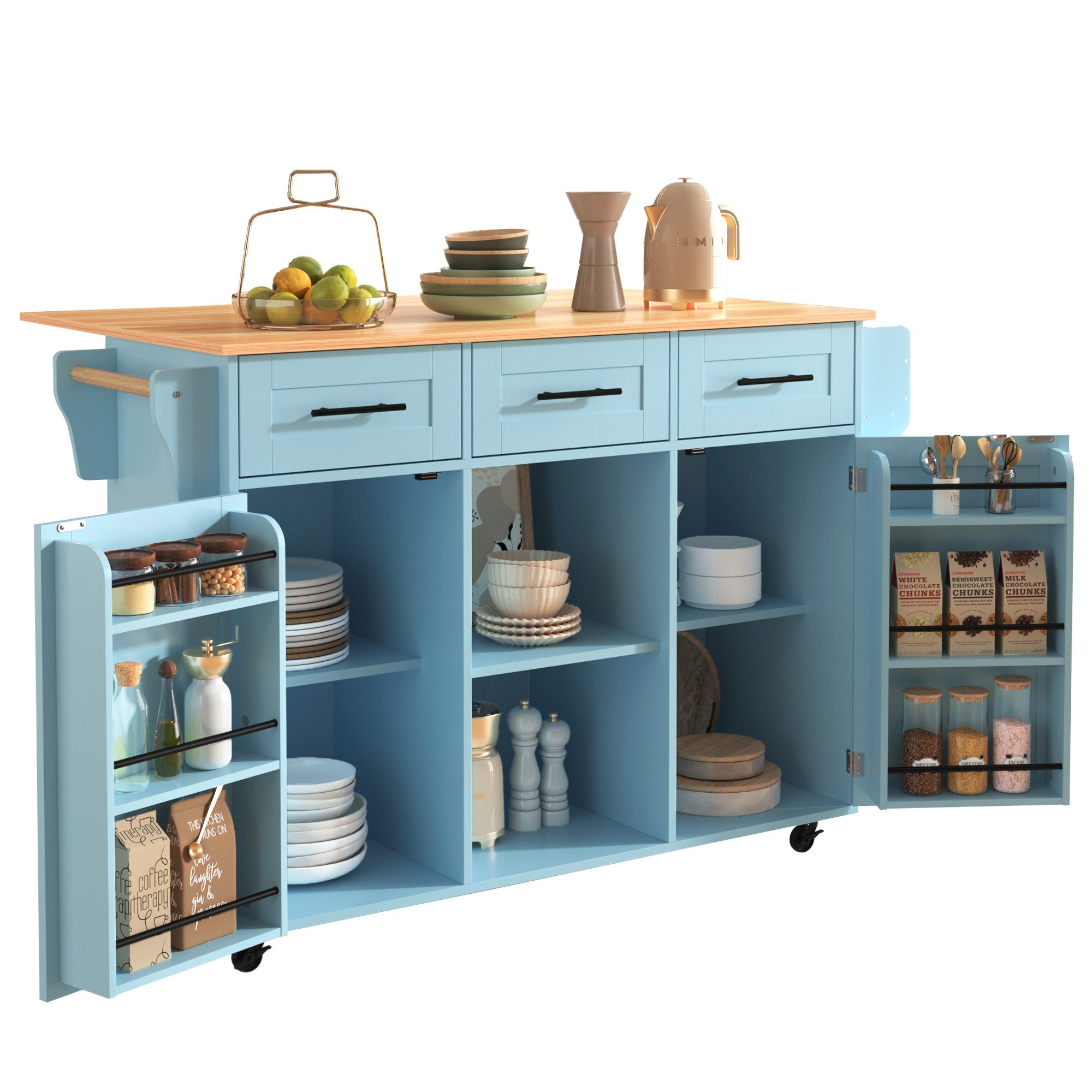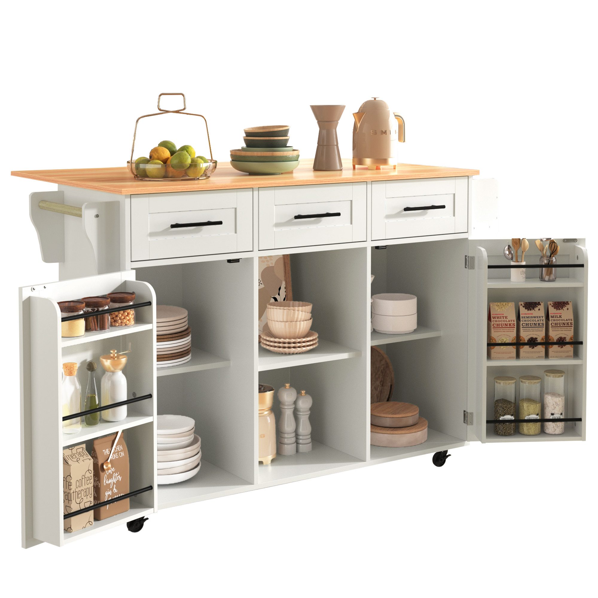 Küchenwagen mit klappbarer Tischplatte und Stauraumregal an der Innenseite der Türen.