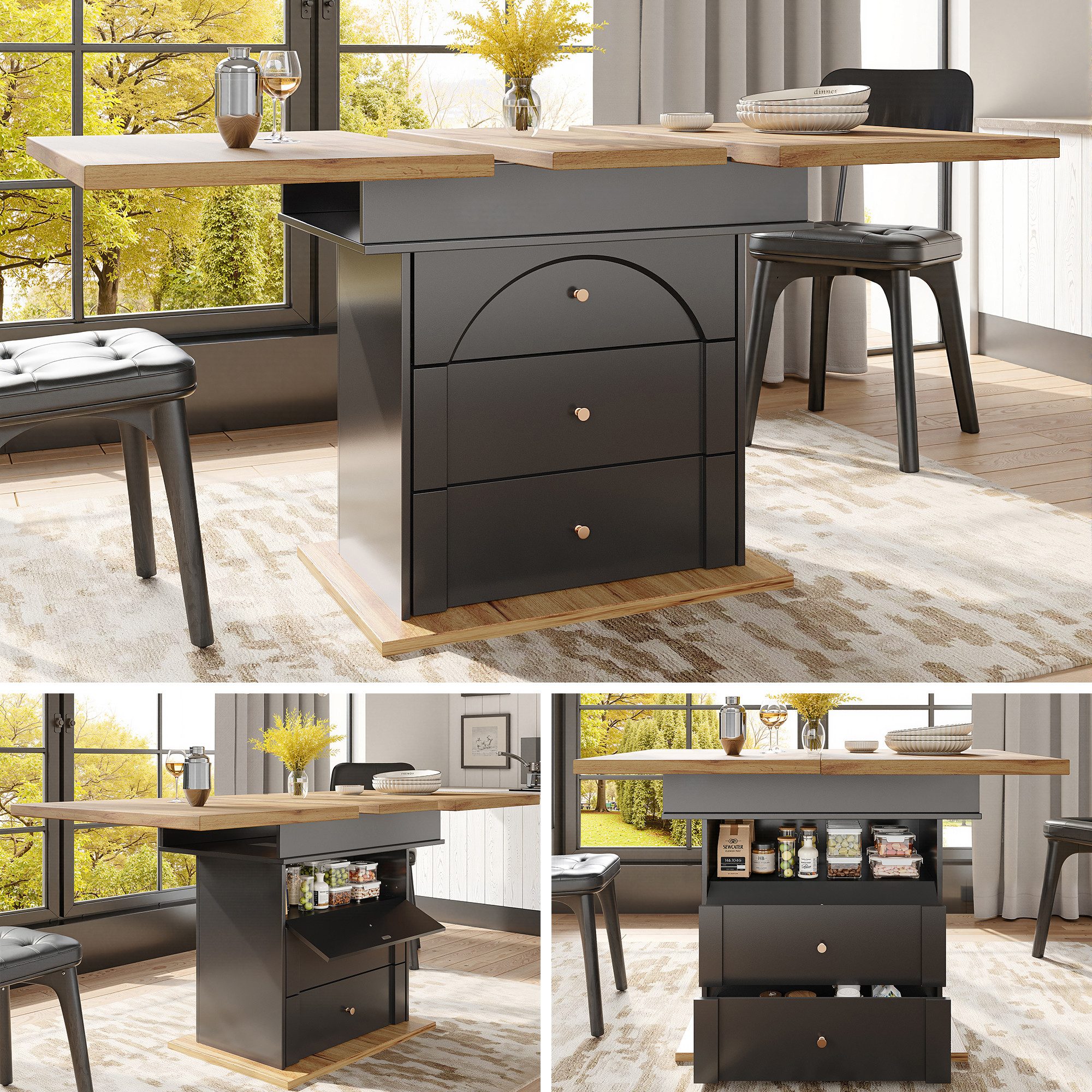 Dank seines durchdachten Designs lässt sich dieser Tisch vielseitig einsetzen: als stilvoller Esstisch im Wohn- oder Essbereich, als funktionaler Schreibtisch im Homeoffice oder als elegante Präsentationsfläche für Dekoration, Bücher oder Technik. Die Kombination aus flexibler Funktionalität, intelligenter Stauraumlösung und hochwertiger Verarbeitung macht ihn zur idealen Wahl für moderne Haushalte.
