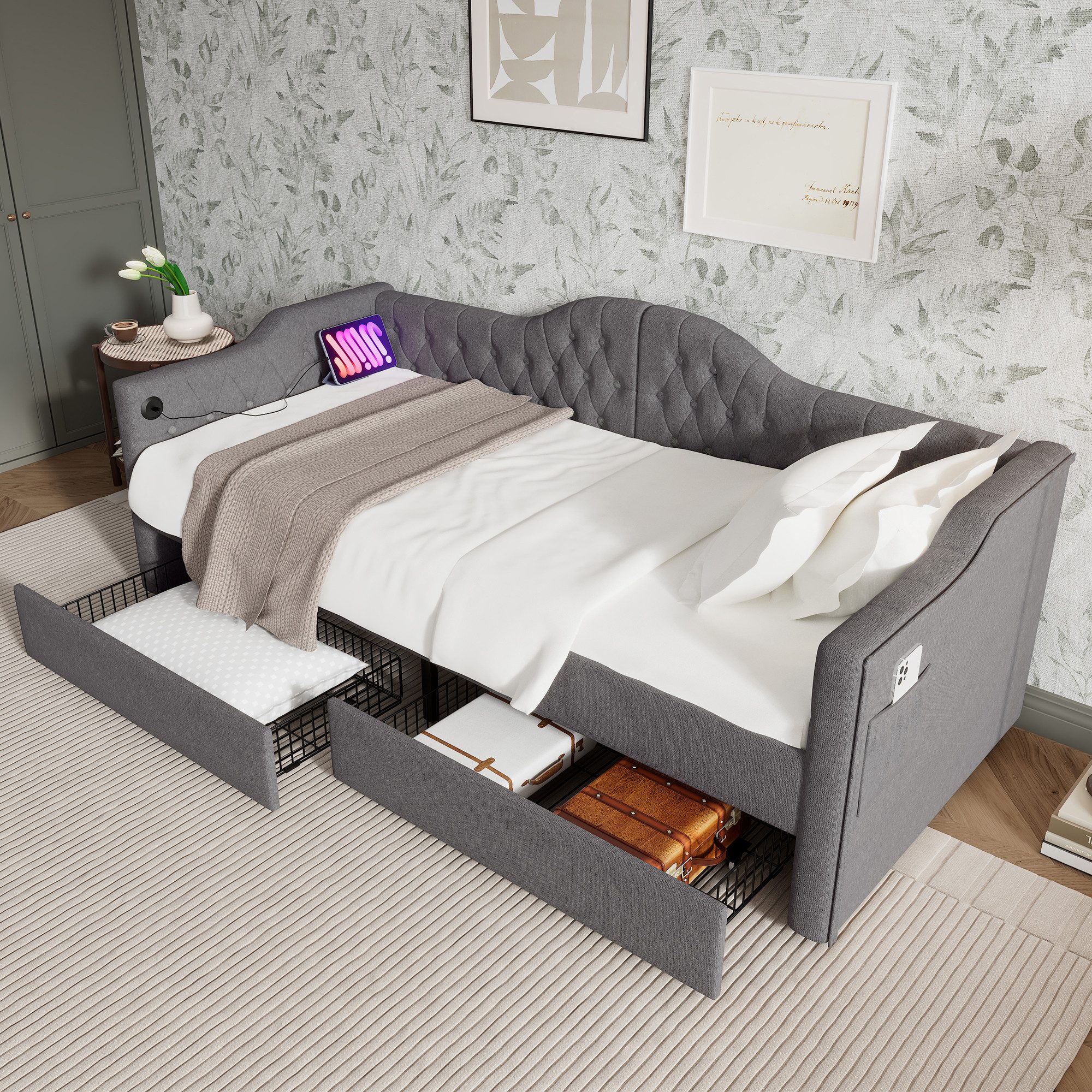 Dieses elegante und zeitlose Tagesbett verfügt über eine stilvolle getuftete Rückenlehne und bezaubernde, wolkenförmige Geländer, gepolstert mit luxuriösem Samtstoff. Sein schlanker Rahmen und das klassische Design fügen sich nahtlos in verschiedene Raumdekore ein und machen es zur perfekten Wahl für ein Kinderzimmer, kleines Wohnzimmer oder Gästezimmer. Der stabile Rahmen aus Stahl, Massivholz und MDF-Platten bietet eine maximale Kapazität von 350 LBS. Die Armlehne, gefüllt mit hochdichtem Schaumstoff und gefertigt aus schickem Samtstoff in Beige, sorgt für ein stützendes und gemütliches Erlebnis. Praktischer Stauraum wird durch zwei Schubladen und zwei Seitentaschen geboten. Integrierte USB- und Typ-C-Anschlüsse in der Nähe der Armlehne ermöglichen das einfache Aufladen Ihrer Geräte.