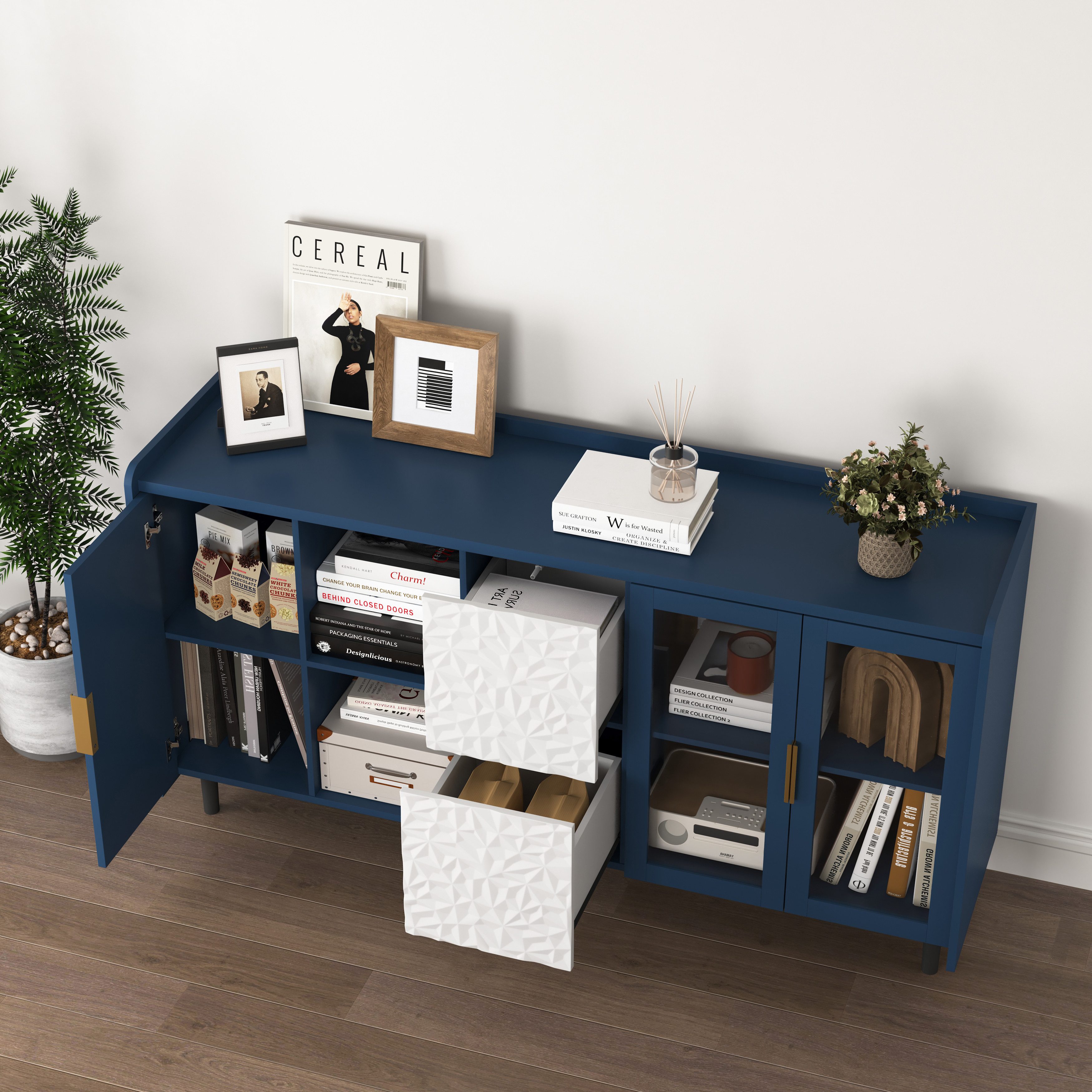 Mit seiner eleganten Kombination aus Glastüren, dekorativen Schubladenelementen und einer großzügigen Tischplatte wird das Sideboard zum Highlight in jedem Raum. Das klare, moderne Design harmoniert sowohl mit minimalistischen Einrichtungen als auch mit klassischen Wohnkonzepten. Dank dieser Vielseitigkeit bleibt das Möbelstück über Jahre hinweg zeitlos und elegant, unabhängig von wechselnden Einrichtungsstilen.
