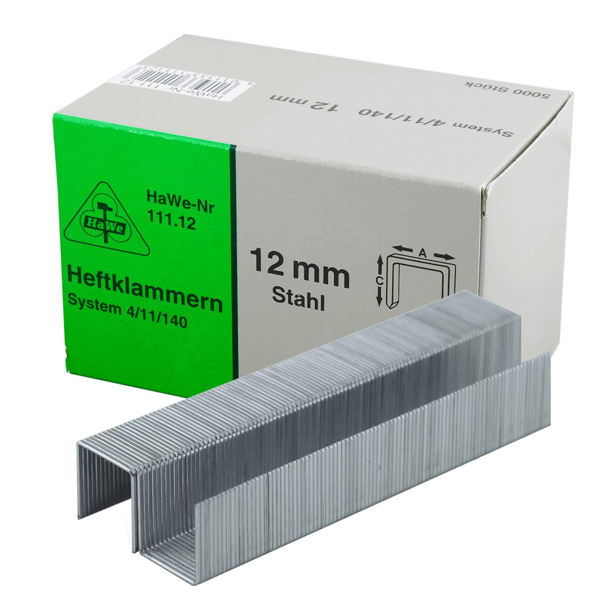 Die HaWe Heftklammern nach System 11/140 sind robuste Flachdrahtklammern aus Stahl, verpackt zu 5 000 Stück. Sie passen in zahlreiche Schlag-, Elektro- und Luftdrucktacker verschiedenster Marken und sorgen für sicheren Halt bei Polster-, Holz- und Folienarbeiten.