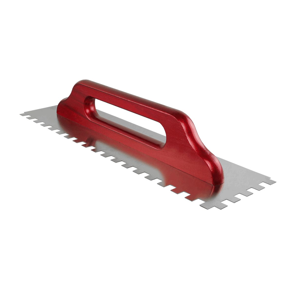 Glättekelle mit rotem Holzgriff und einem gezahnten Blatt aus rostfreiem Edelstahl