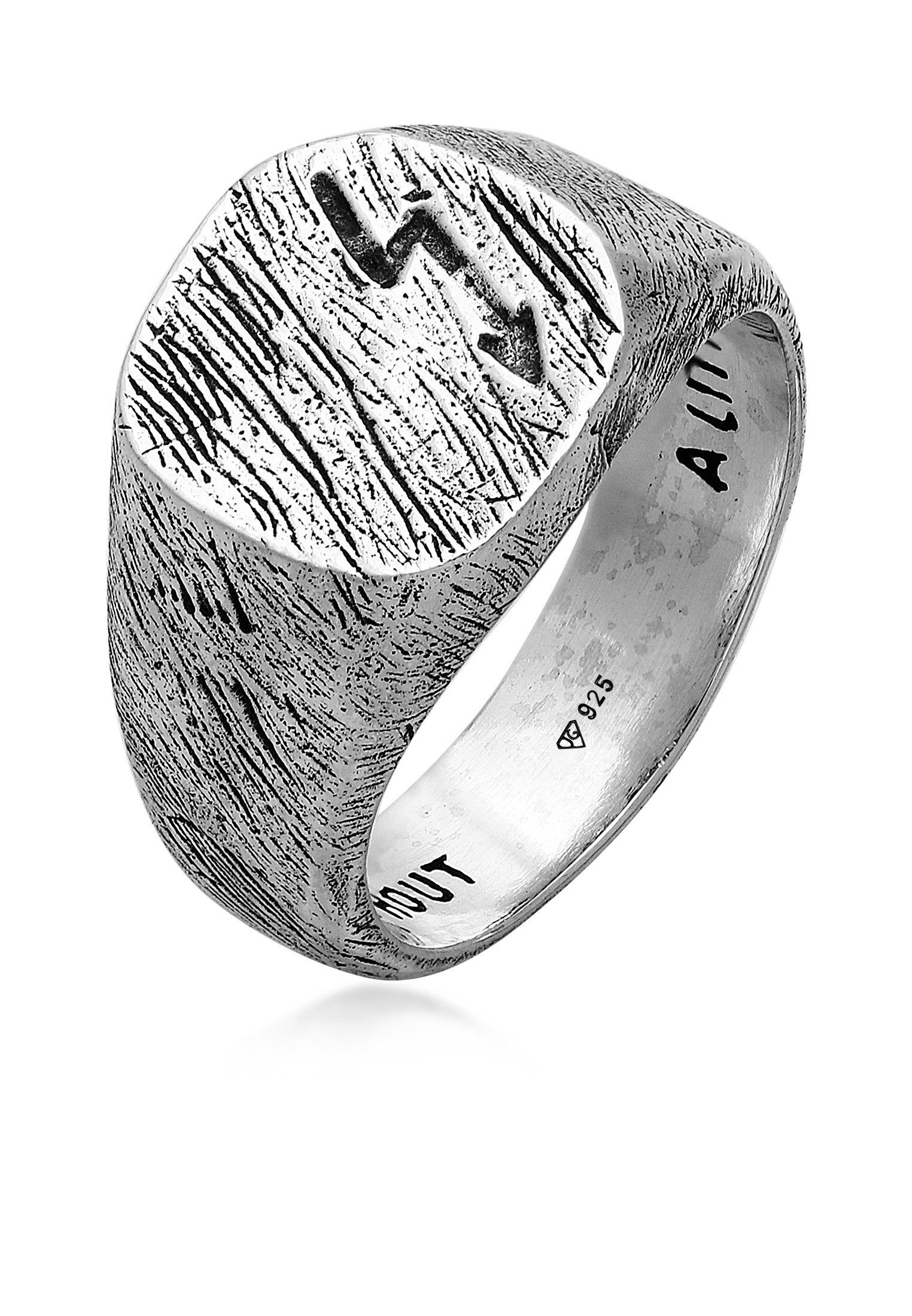 Dieser Siegelring "Thunder" auf massivem 925er Sterling Silber handgefertigt, ist ein Statement Schmuck mit besonderem Charme. Der kunstvoll gebürstete, mit oxidierten Effekten designte Herrenring stellt auf der Ringoberseite einen Blitz dar. Der Blitz symbolisiert Kraft und Stärke, aber auch die unkontrollierbare Natur und Unvorhersehbarkeit der Menschheit und des eigenen Lebens. Die Inschrift „What is life without a little risk“ auf der Ringinnenseite, ist eine stätige Erinnerung daran, Risiken einzugehen und den Schwankungen des eigenen Lebens mit Stärke, Mut und Kraft zu begegnen. Ein Herren Accessoire im angesagten Vintage Look, als stylischer Begleiter für jeden Anlass.