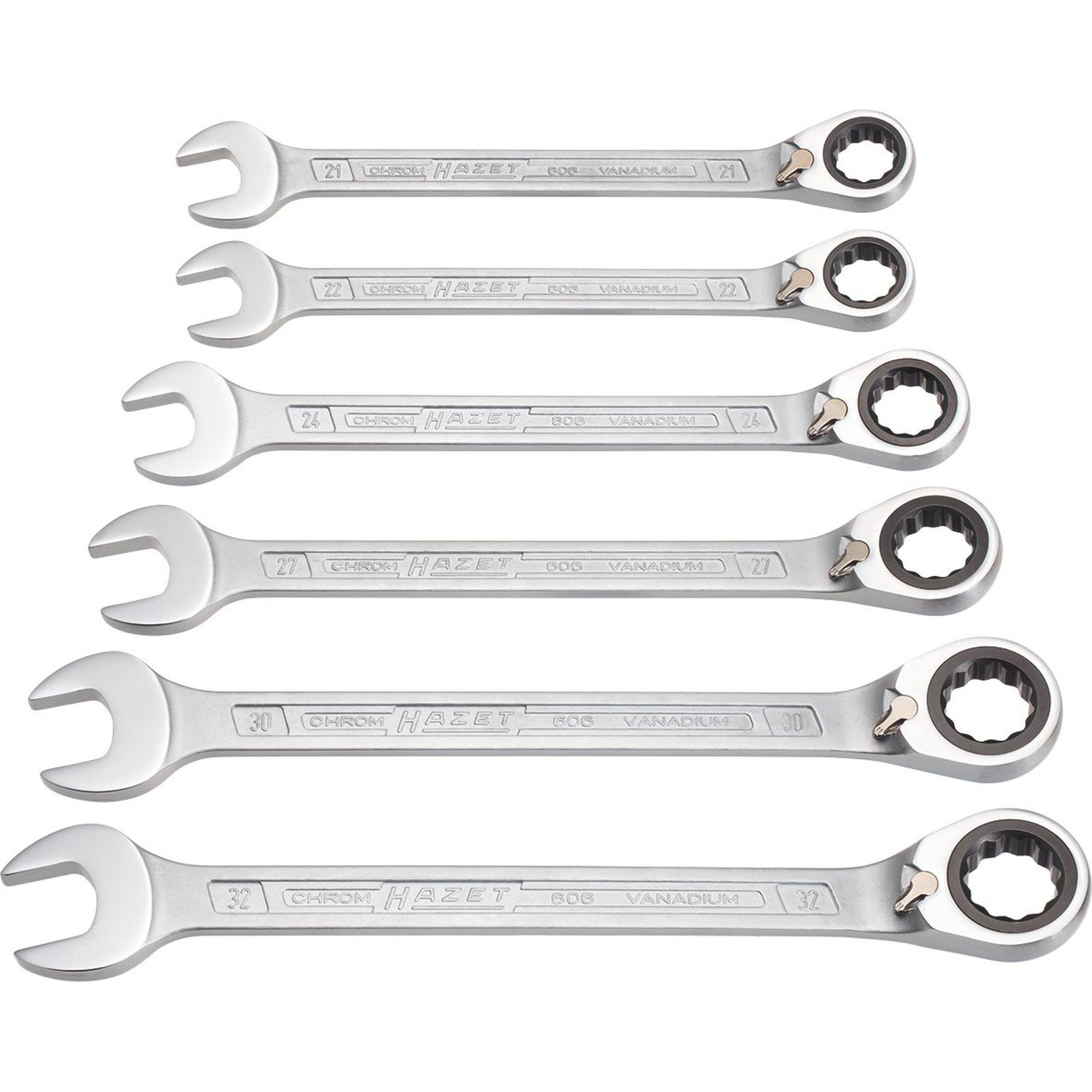mit umschaltbarer Knarrenfunktion Der HAZET Knarren-Ring-Maulschlüssel-Satz 606/6-1 in der langen, schlanken Ausführung verfügt über beidseitig gleiche Schlüsselweiten. Der Schaft mit extra stabilem HAZET-Doppel-T-Profil ist verchromt, die Schlüsselköpfe sind poliert. Die Ringseiten (Doppel-Sechskant) verfügen über eine umschaltbare Knarrenfunktion zur Betätigung schwer zugänglicher Schraubverbindungen auf engstem Raum, ohne Umsetzen des Schlüssels, außerdem über das von HAZET speziell für Schraubenschlüssel und Steckschlüssel entwickelte Tractionsprofil ohne scharfe Kanten oder Spitzen. Durch die vergrößerte Anlagefläche des Tractionsprofils im Schlüssel wird eine sichere Übertragung des Drehmoments ermöglicht und die Kerbwirkung auf ein Minimum reduziert. Das schützt den Schraubenkopf optimal vor Beschädigungen und Eckverschleiß. Sogar beschädigte und abgenutzte Schrauben lassen sich mit dem Tractionsprofil noch sicher lösen, da ein Durchdrehen oder Abrutschen fast ausgeschlossen ist.