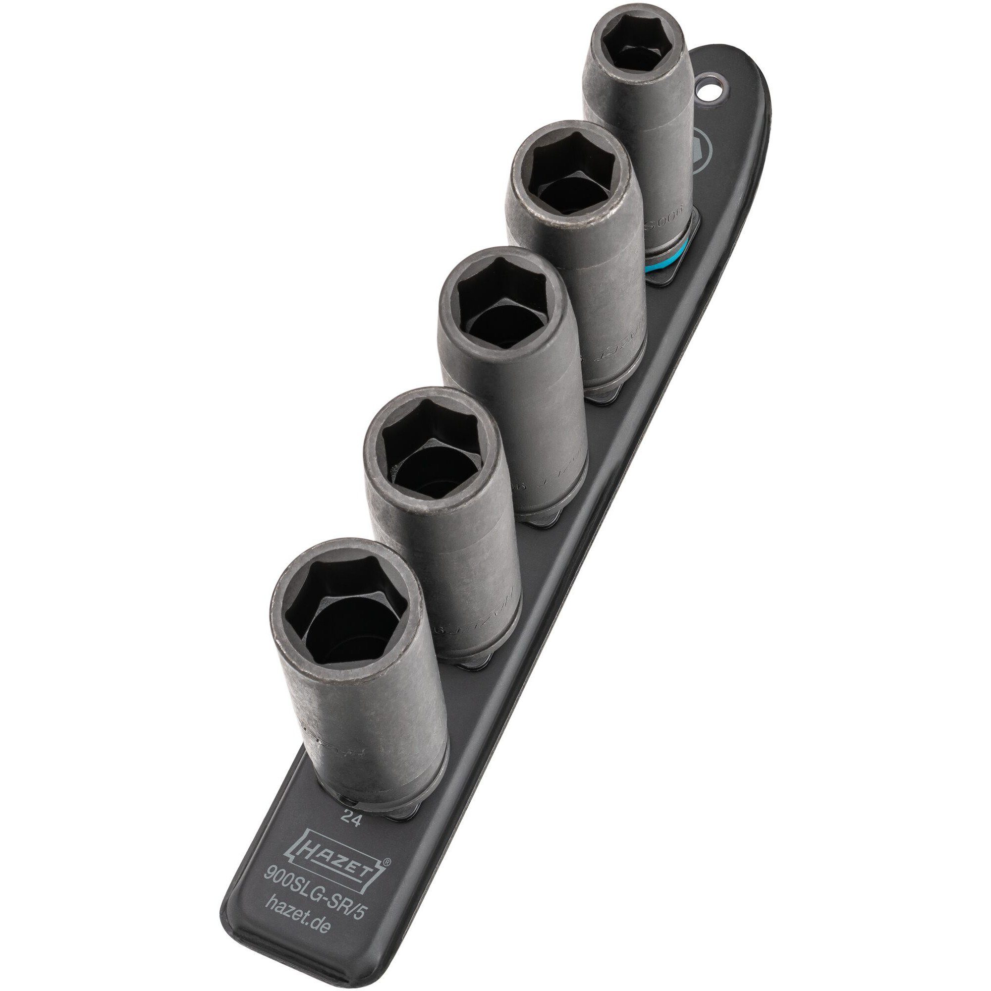 SW 13 - SW 24, lang Das SmartRail 900SLG-SR/5 von HAZET besteht aus einer flexiblen Kunststoffsteckleiste mit 1/2" Vierkantaufnahmen, bestückt mit fünf praktischen 1/2" Steckschlüssel-Einsätzen für Handwerk, Industrie und Werkstätten. Die magnetische Unterseite der SmartRail-Serie gewährleistet einen perfekten Halt auf allen magnetischen Flächen, z.B. an Werkstattwagen, an Werkzeugwänden, Maschinen oder Hebebühnen und in Schubladen. Die langlebige, robuste Drehverriegelung sorgt für einen festen Sitz der Stecknüsse und erlaubt dennoch den sofortigen Zugriff: zur Entnahme den Steckschlüsseleinsatz einfach nach links drehen. Das praktische Piktogramm und die Größenbezeichnung für alle enthaltenen Steckschlüsseleinsätze erleichtern das Finden der benötigten Größe. Die fünf langen Kraftnüsse 900SLG eignen sich für Schlagschrauber und Maschinenschrauber. Sie verfügen über das von HAZET speziell für Schraubenschlüssel und Steckschlüssel entwickelte Tractionsprofil ohne scharfe Kanten oder Spitzen. Durch die vergrößerte Anlagefläche des Tractionsprofils im Steckschlüssel wird eine sichere Übertragung des Drehmoments gewährleistet und die Kerbwirkung auf ein Minimum reduziert. Das schützt den Schraubenkopf optimal vor Beschädigungen und Eckverschleiß. Sogar beschädigte und abgenutzte Schrauben lassen sich mit dem Tractionsprofil noch sicher lösen, da ein Durchdrehen oder Abrutschen fast ausgeschlossen ist. Der Steckschlüssel-Einsatz 900SLG mit Bohrung für Sicherungsstift oder Sicherungsfeder und Rille für O-Ring entspricht den Normen DIN 3129, ISO 2725-2.