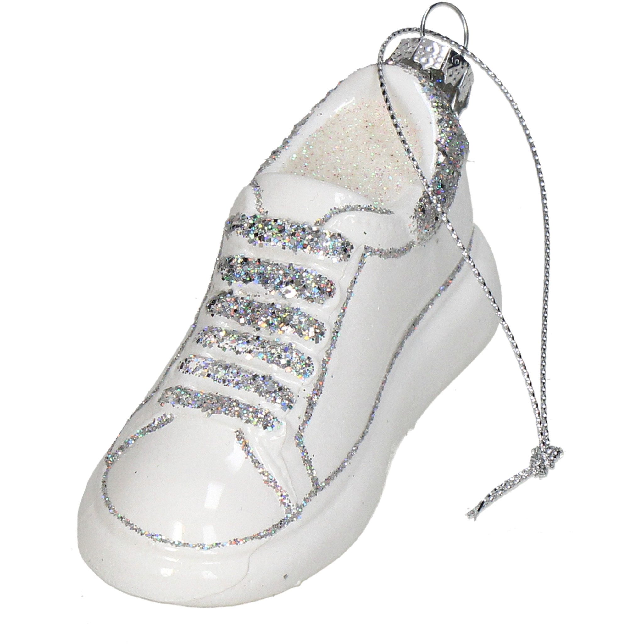 PRODUKT: Weihnachtsbaum Anhänger - Sportschuh / MATERIAL: Glas / GRÖSSE (HxBxL): ca. 11 x 4,5 x 4 cm / INHALT: 1 Christbaumfigur / FARBE: weiß - silber irisierend