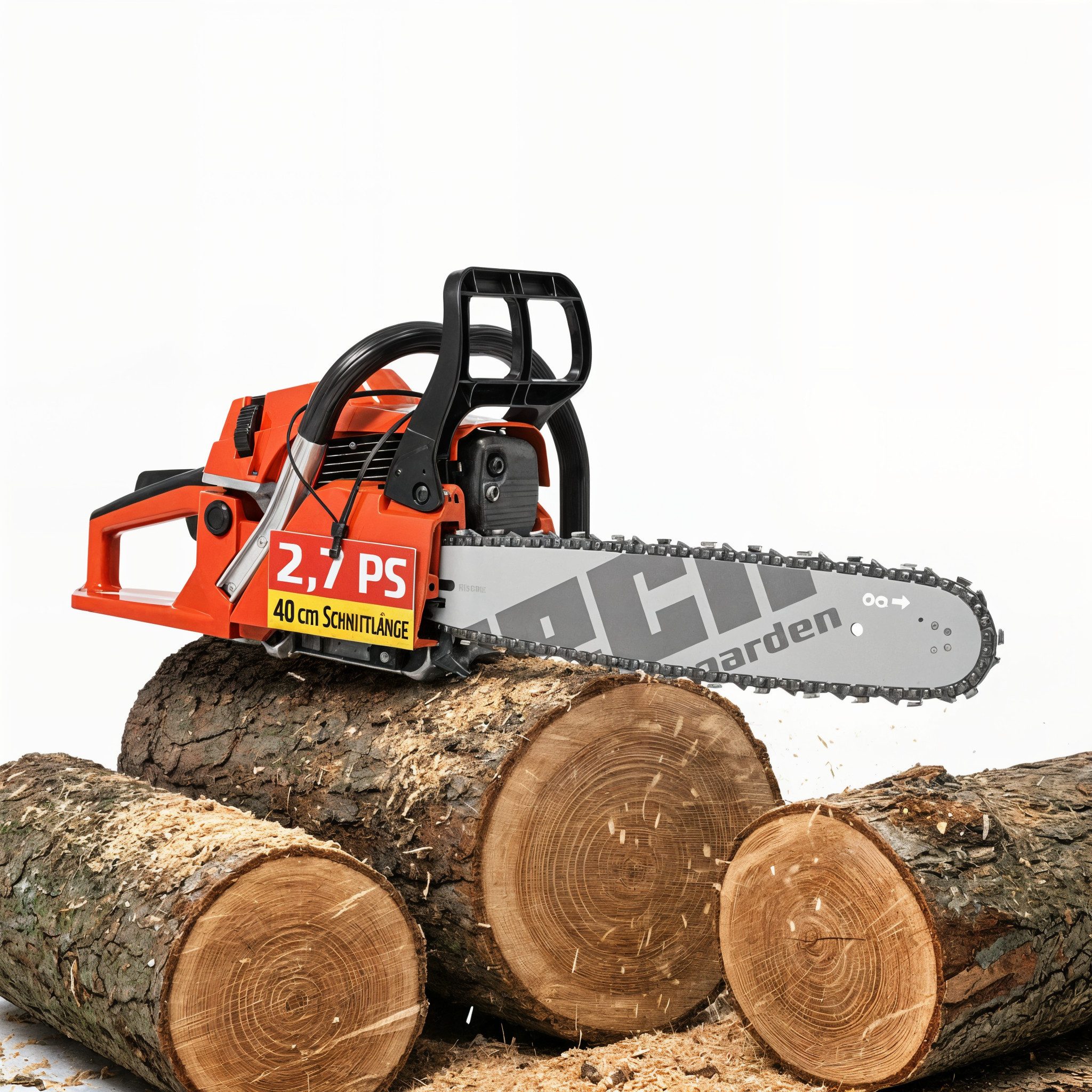 Die Kettensäge ist mit einem luftgekühlten 2-Takt-Motor ausgestattet, der 2,7 PS bei 10.000 U/min liefert. Das ermöglicht kraftvolles und präzises Sägen bei unterschiedlichsten Holzarbeiten.